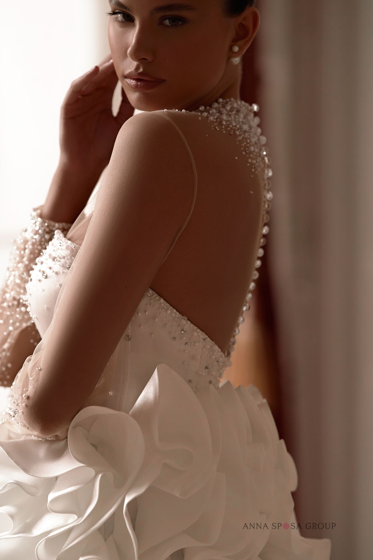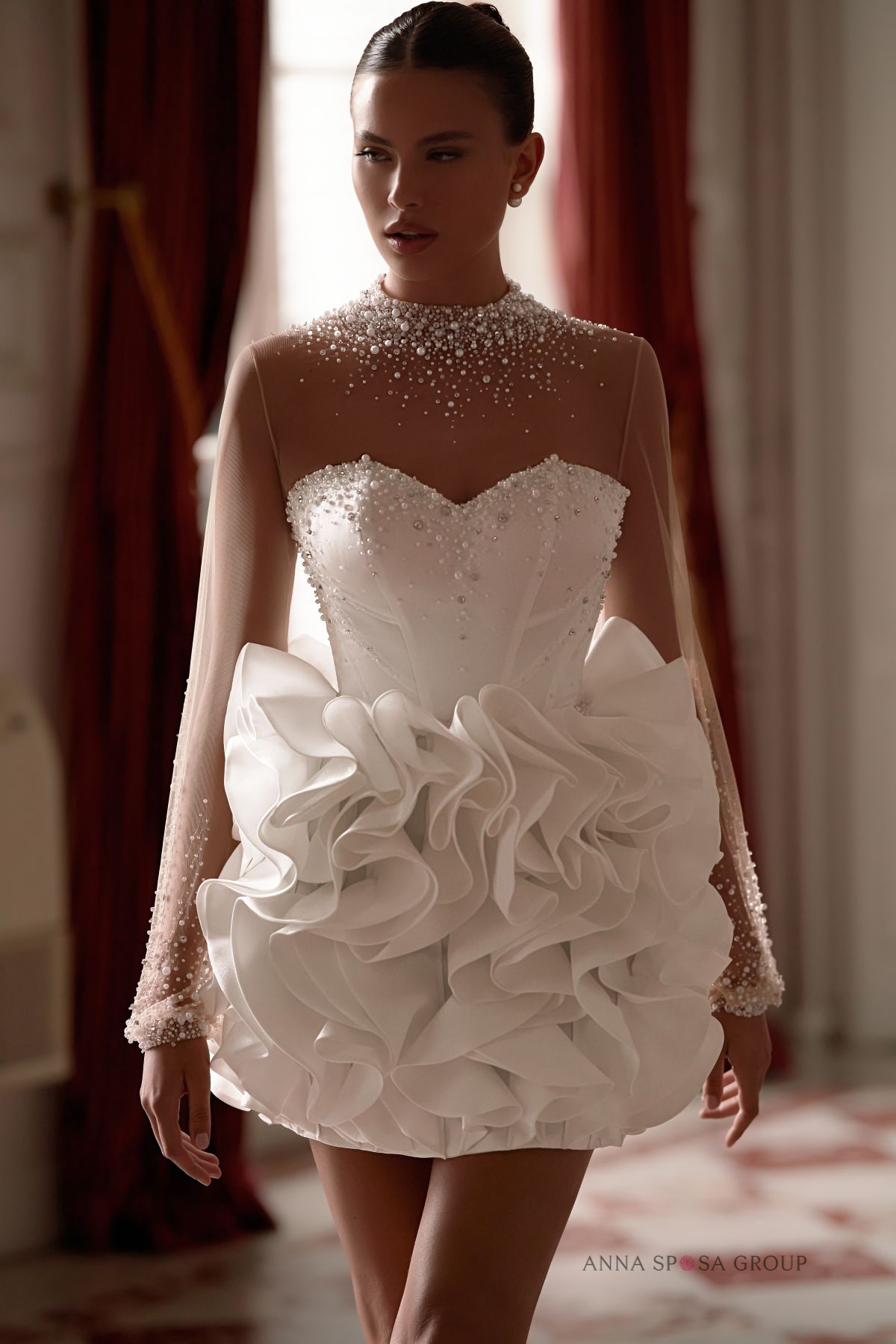 Λεπτομέρειες: ένα εντυπωσιακό μίνι φόρεμα με ογκώδη φούστα. Ο κορσές είναι κεντημένος με πέρλες, χάντρες και παγέτες. Ένα ημιδιάφανο κορμάκι με μακριά μανίκια, κεντημένο με χάντρες κρύσταλλα και πέρλες, συμπληρώνει το σύνολο.