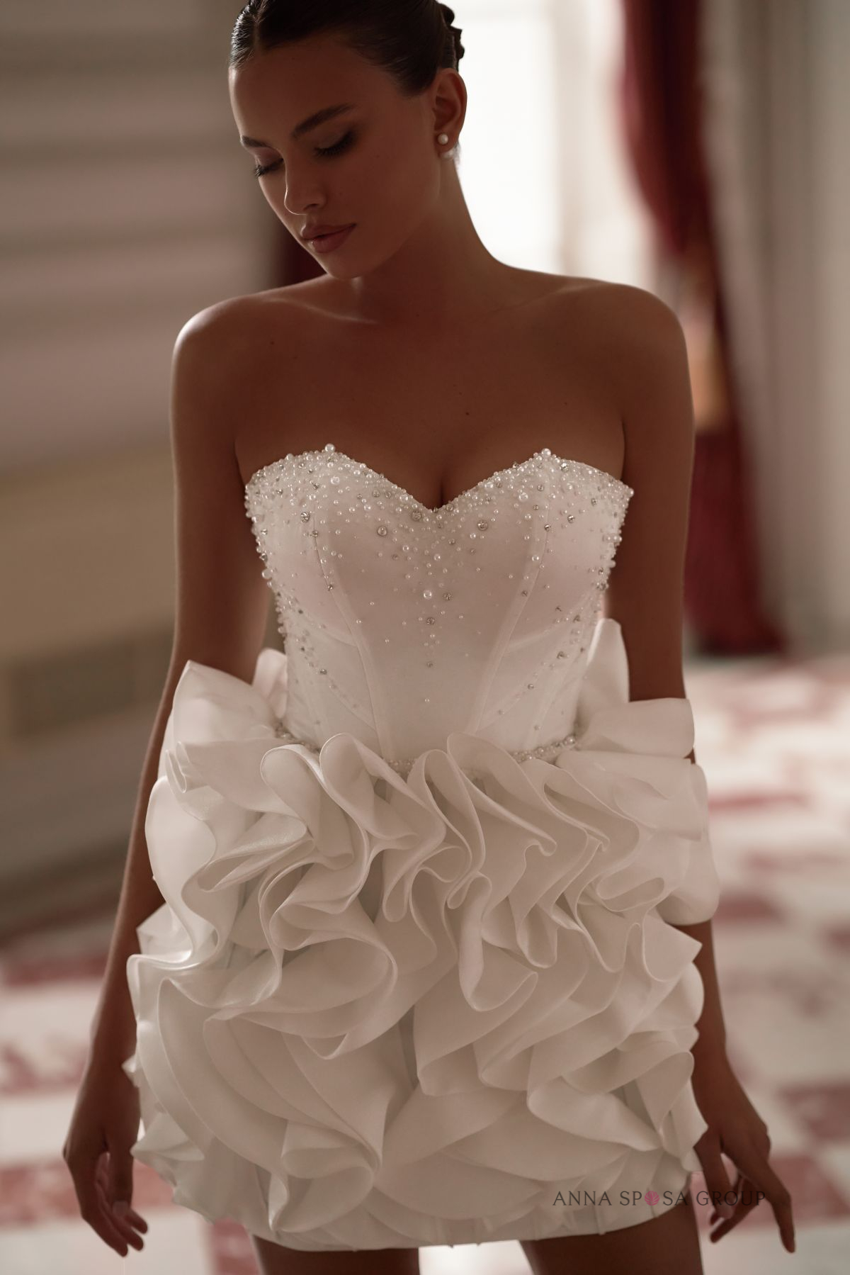 Μίνι Νυφικό φόρεμα σατέν διακοσμημένο με πέρλες & κρύσταλλα.