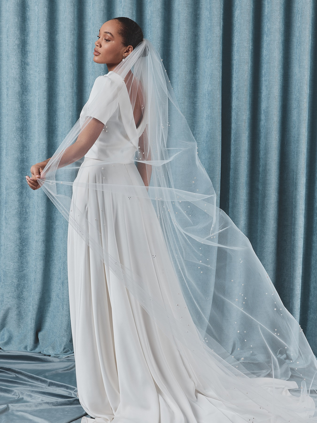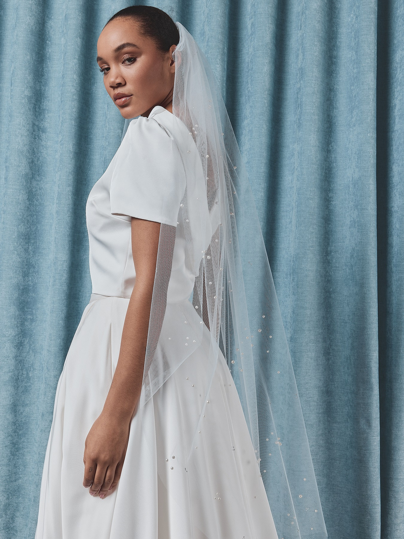 Μάθετε περισσότερα για το προϊόνΜονό πέπλο κατασκευασμένο από τούλι και διακοσμημένο από πέρλες σε matte όψη και στρας