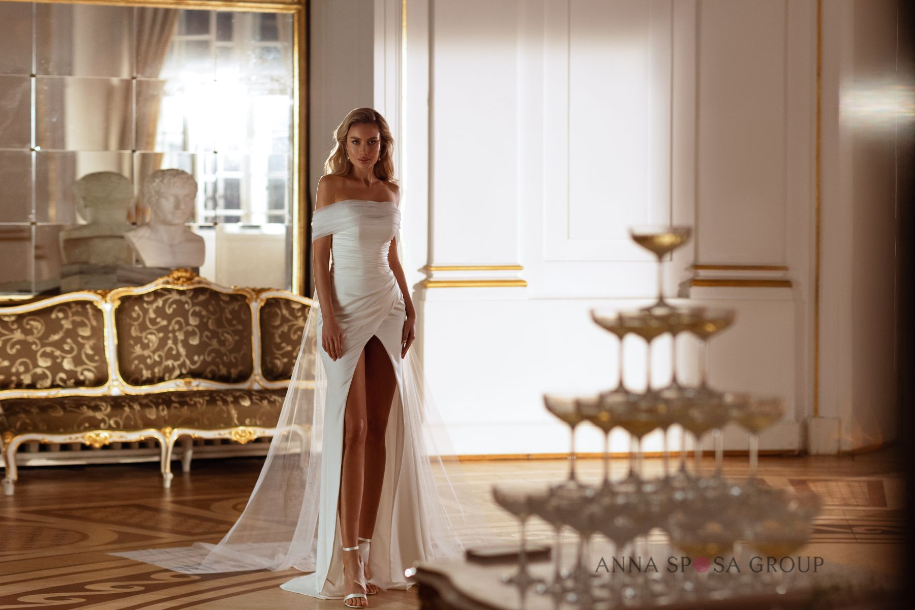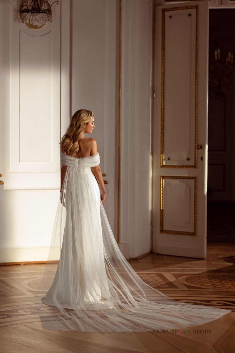 Νυφικό σατέν φόρεμα σε στενή γραμμή με σκίσιμο. Συνδυάζεται με αποσπώμενη τούλινη κάπα