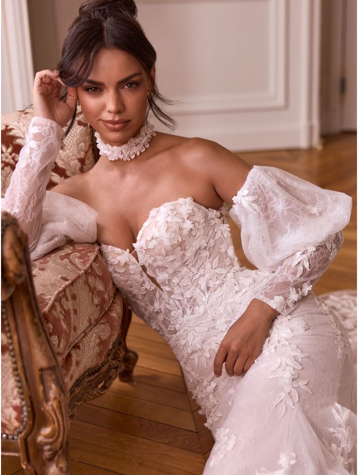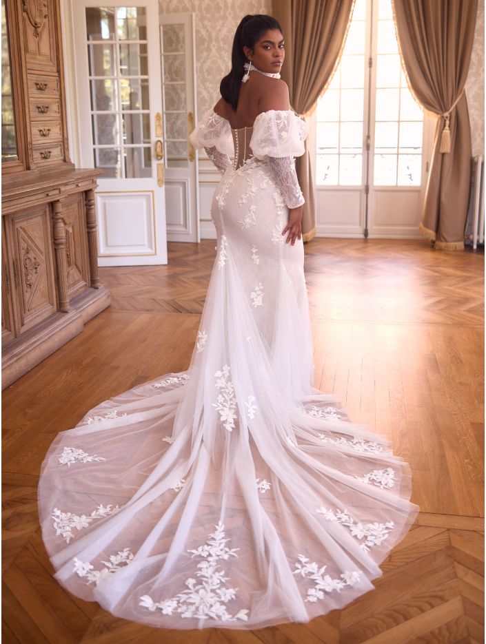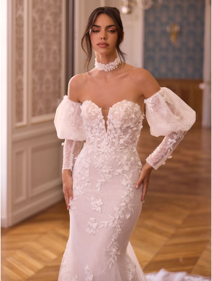 Γοργονέ νυφικό φόρεμα από δαντέλα και τούλι με γκλίτερ για περισσότερη λάμψη. Περιλαμβάνει και τα αποσπώμενα μανίκια
