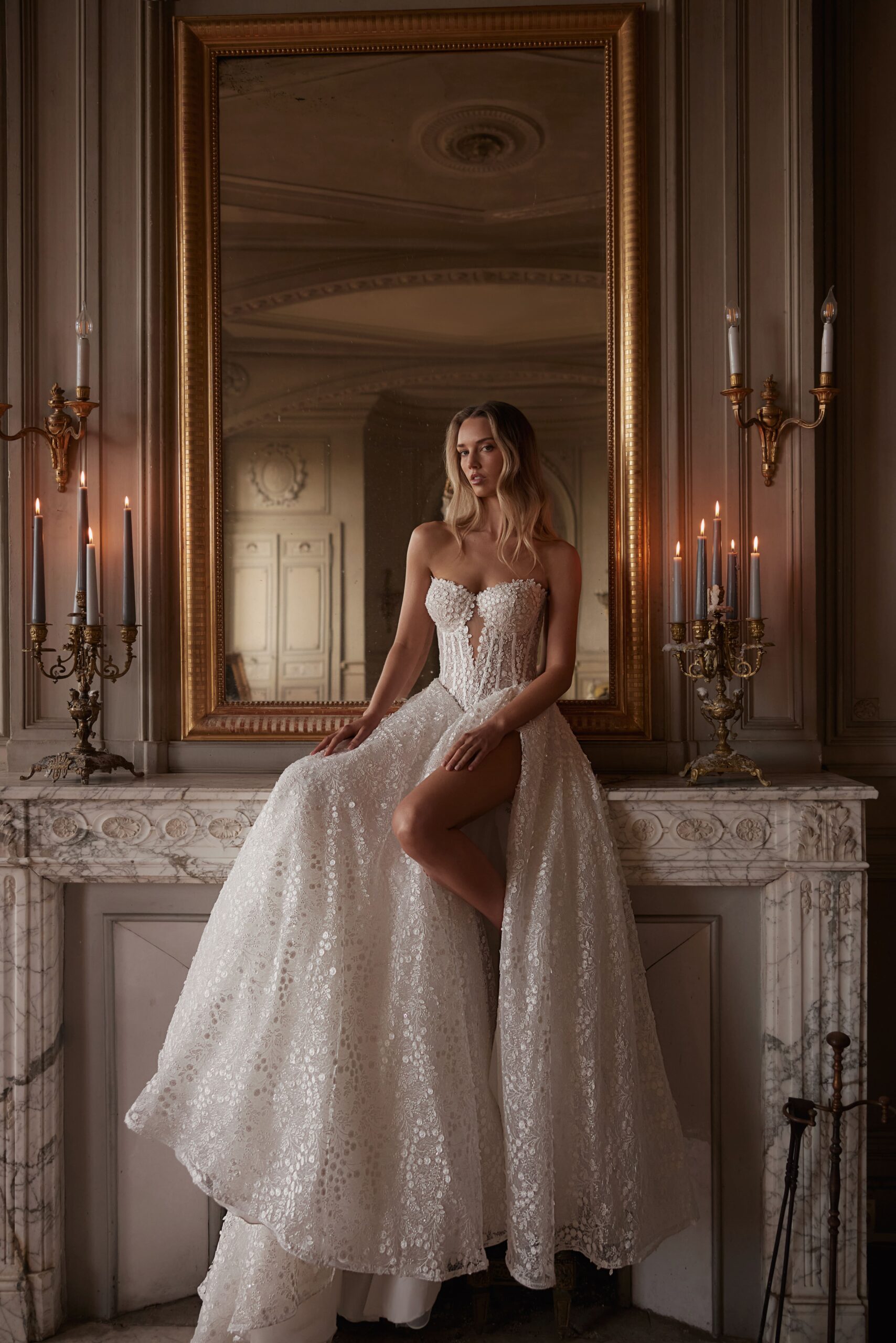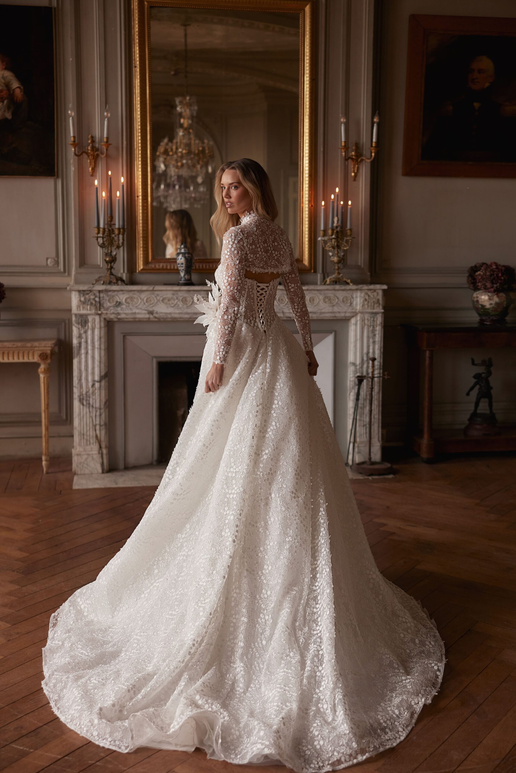 Συνδυάζεται με μπολερό από την ίδια δαντέλα του φορέματος.