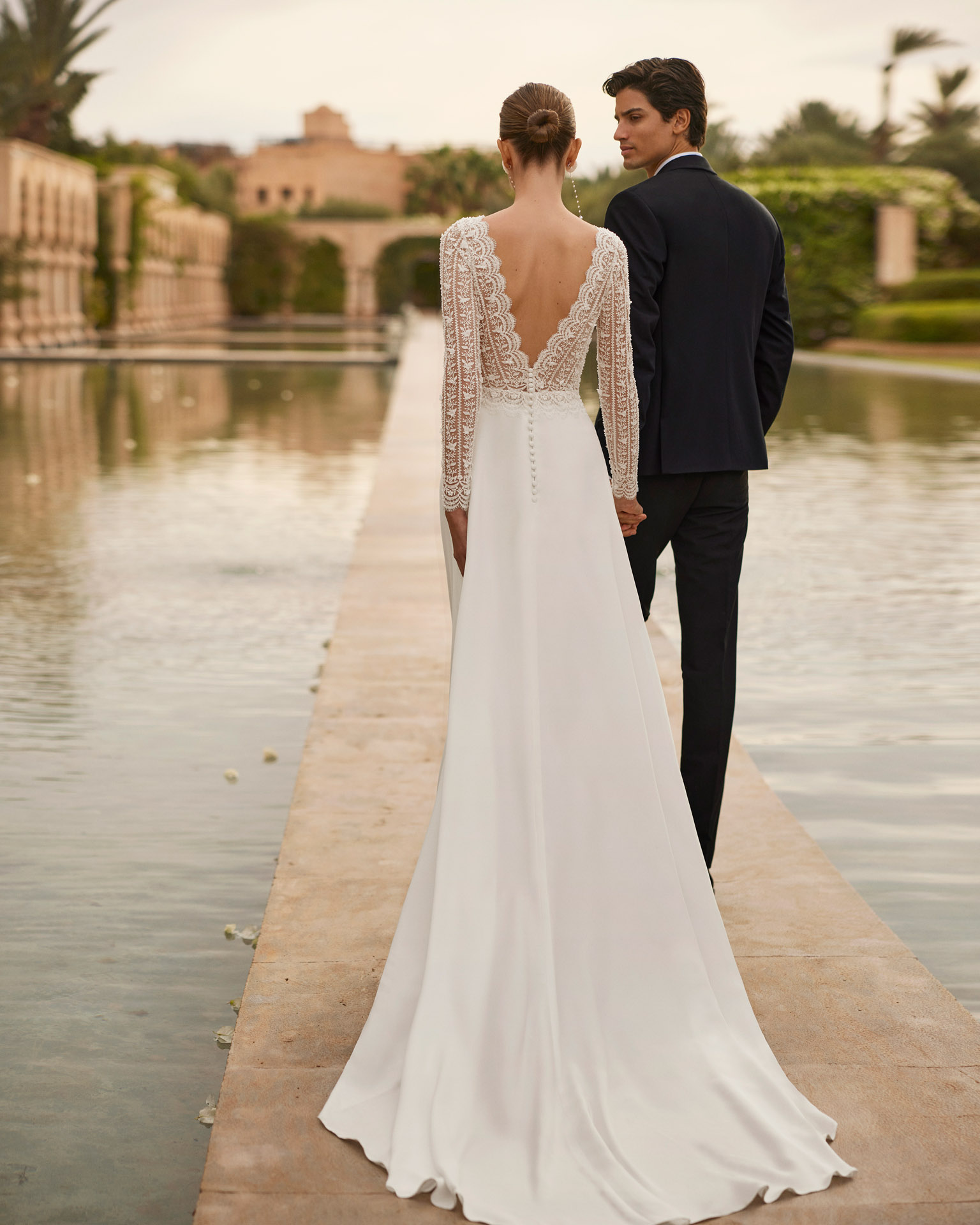 Μακρύ νυφικό σε γραμμή Α. Φτιαγμένο από ελαστικό κρεπ με δαντέλα και μπούστο με χάντρες, λαιμόκοψη bateau, μακριά μανίκια και πλάτη σε σχήμα V.