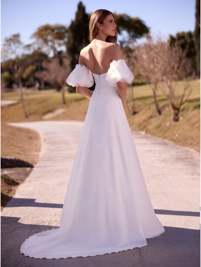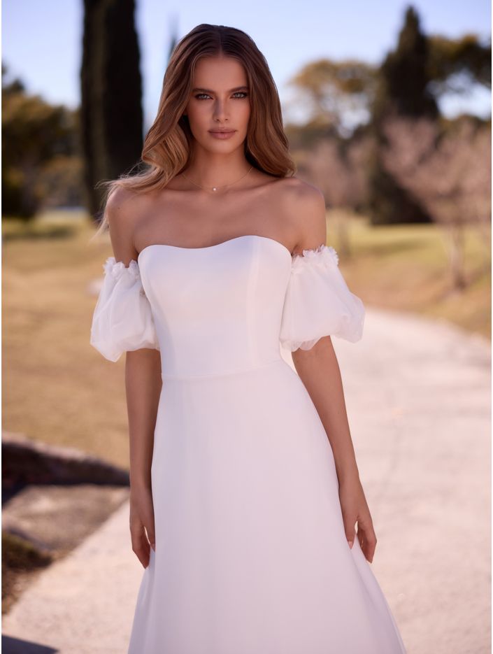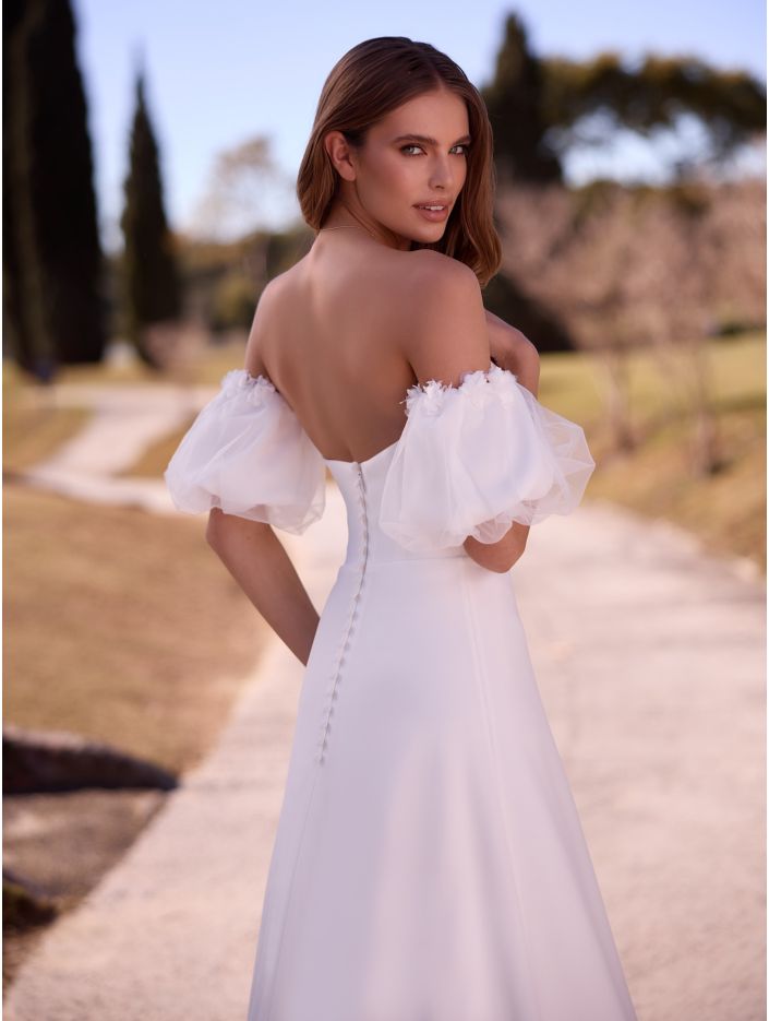 Νυφικό φόρεμα ιβουάρ σε Α-Γραμμή από ελαστικό κρεπ  και αποσπώμενα κοντά φουσκωτά μανίκια