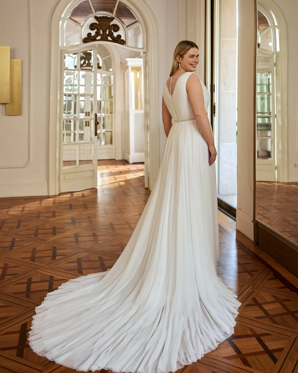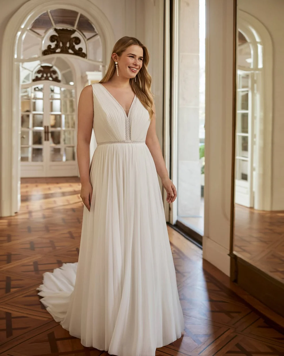 Το νυφικό φόρεμα ιδανικό για νύφες PLUS SIZE αποτυπώνει τη διαχρονική κομψότητα με τη γραμμή Α. Nτεκολτέ V. Δημιουργημένο από τη Rosa Clara Martha Blanc. Αυτό το αιθέριο φόρεμα διαθέτει μια αέρινη φούστα από τούλι, μουσελίνα και λεπτομέρειες δαντέλας. Ιδανικό για τη νύφη που αναζητά διακριτική κομψότητα και ρομαντική γοητεία την ημέρα του γάμου της.