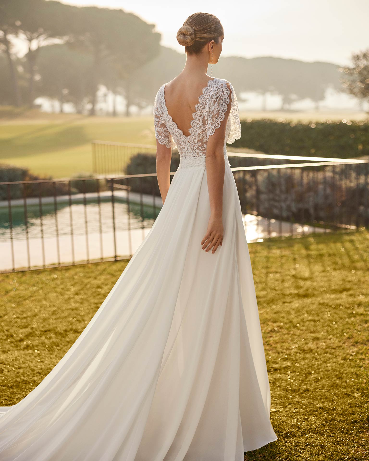 Ρομαντικό νυφικό σε γραμμή Α. Ζορζέτα με δαντέλα και μπούστο με χάντρες, μανίκια σε σχήμα πεταλούδας και πλάτη σε σχήμα V με ουρά.