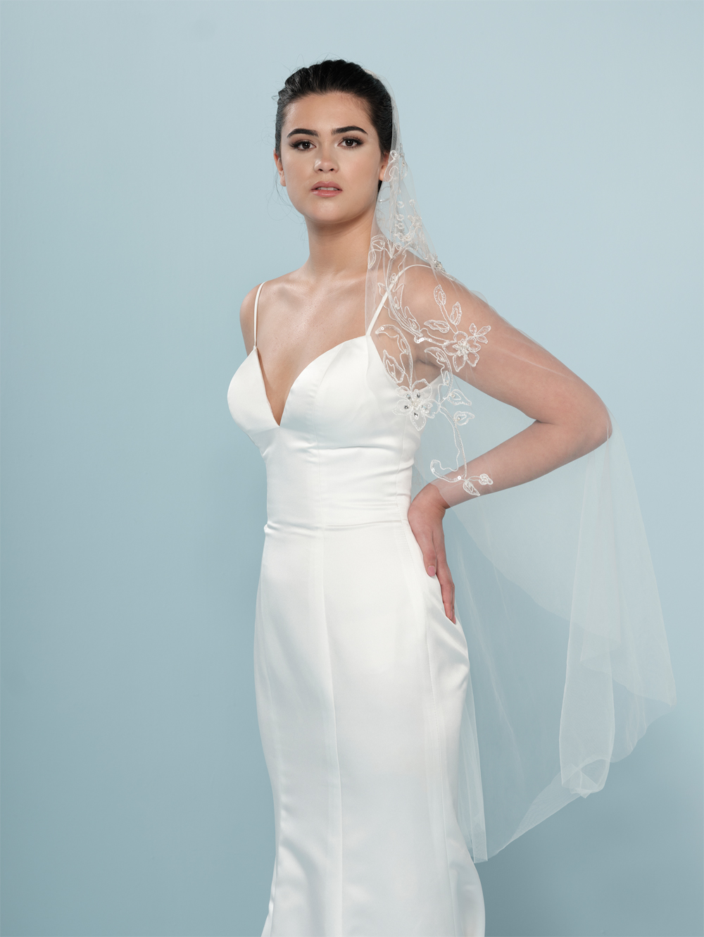 Μάθετε περισσότερα για το προϊόνΜονό πέπλο από μαλακό τούλι σε χρώμα του πάγου με κεντητό μοτίβο λουλουδιών, πούλιες, μαργαριτάρια και κρύσταλλα.