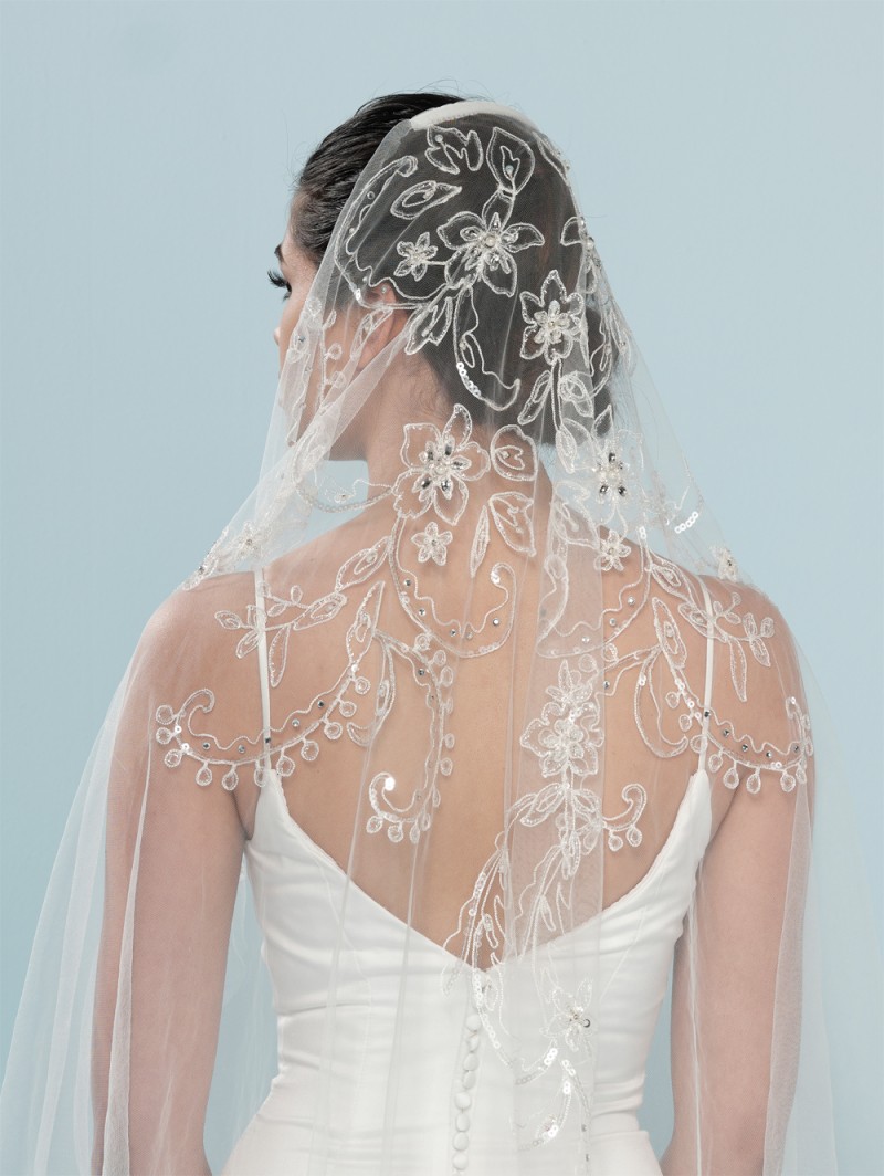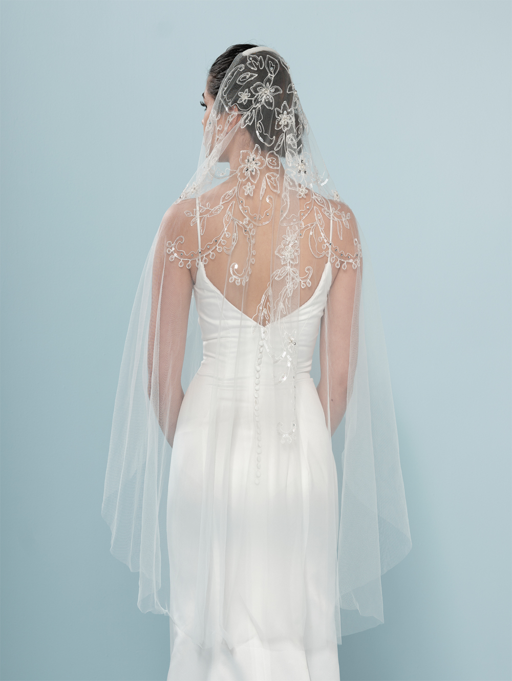 Μονό πέπλο από μαλακό τούλι σε χρώμα του πάγου με κεντητό μοτίβο λουλουδιών, πούλιες, μαργαριτάρια και κρύσταλλα.