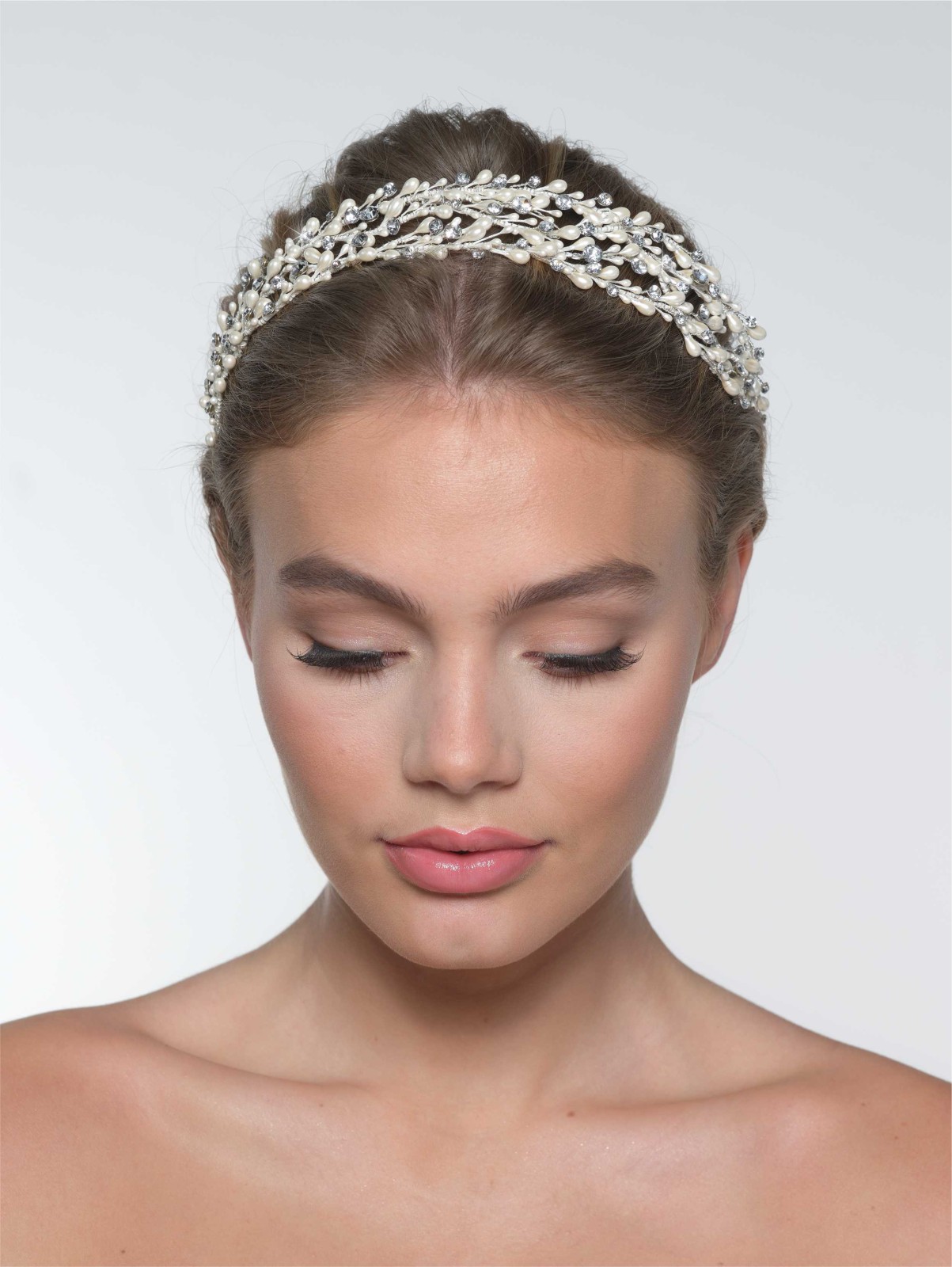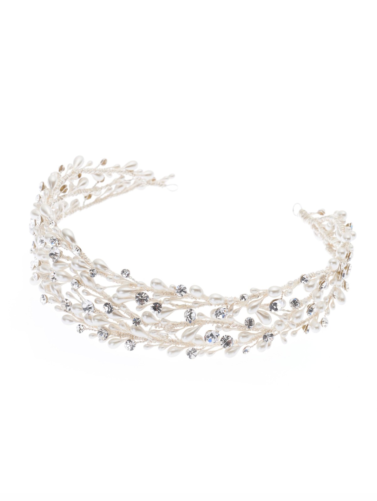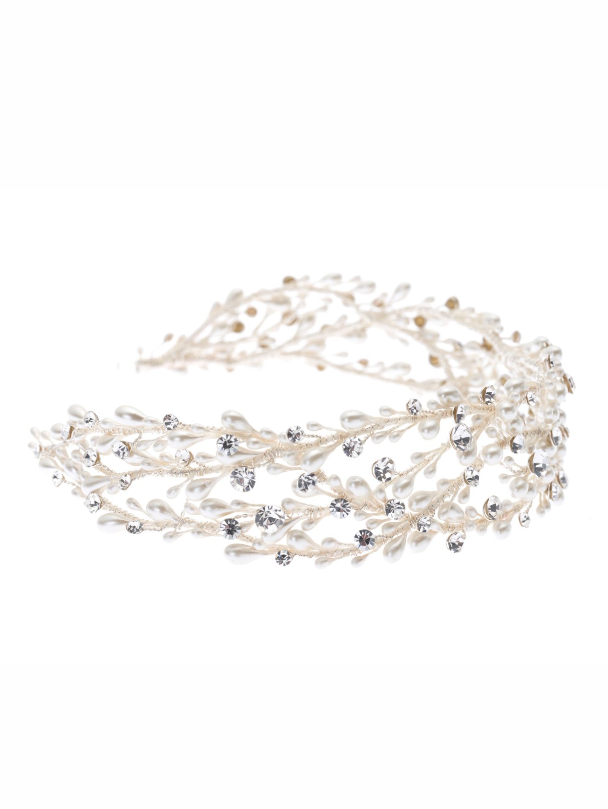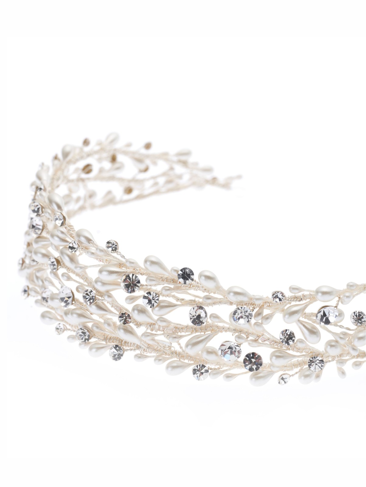 Νυφική στέκα με ασημένια βάση με τρείς σειρές από κρυσταλλάκια και ιβουάρ πέρλες