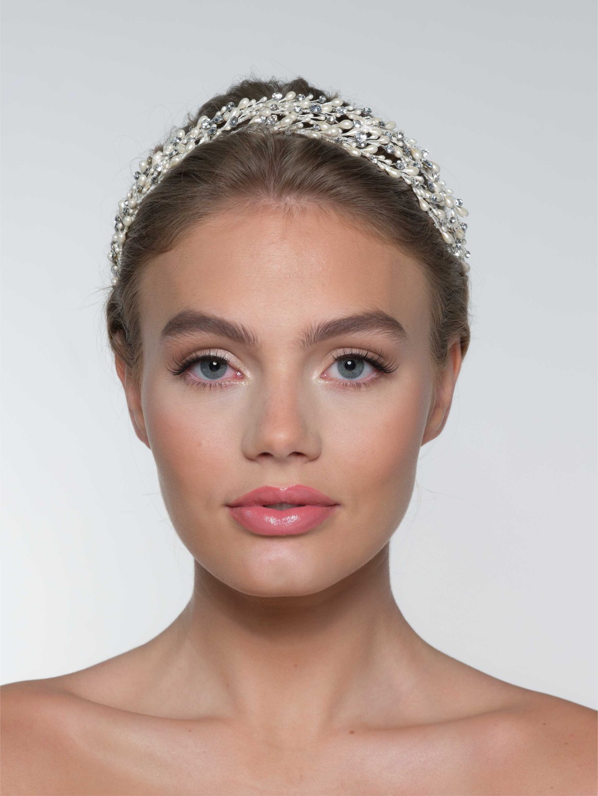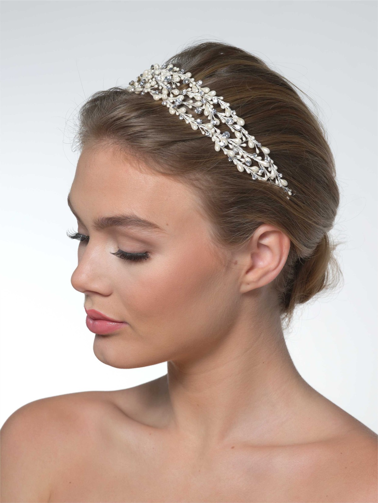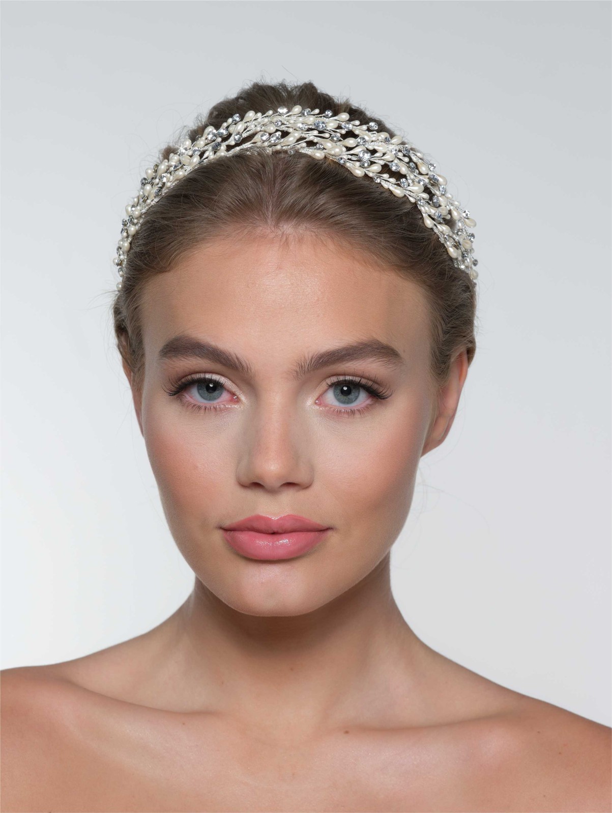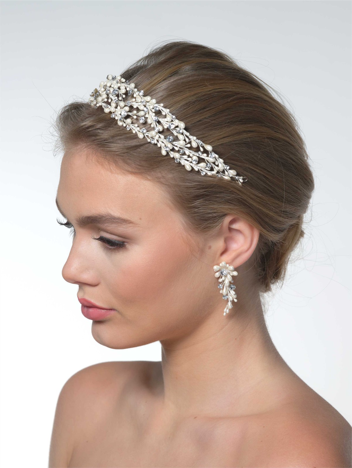 Νυφική στέκα με ασημένια βάση με τρείς σειρές από κρυσταλλάκια και ιβουάρ πέρλες