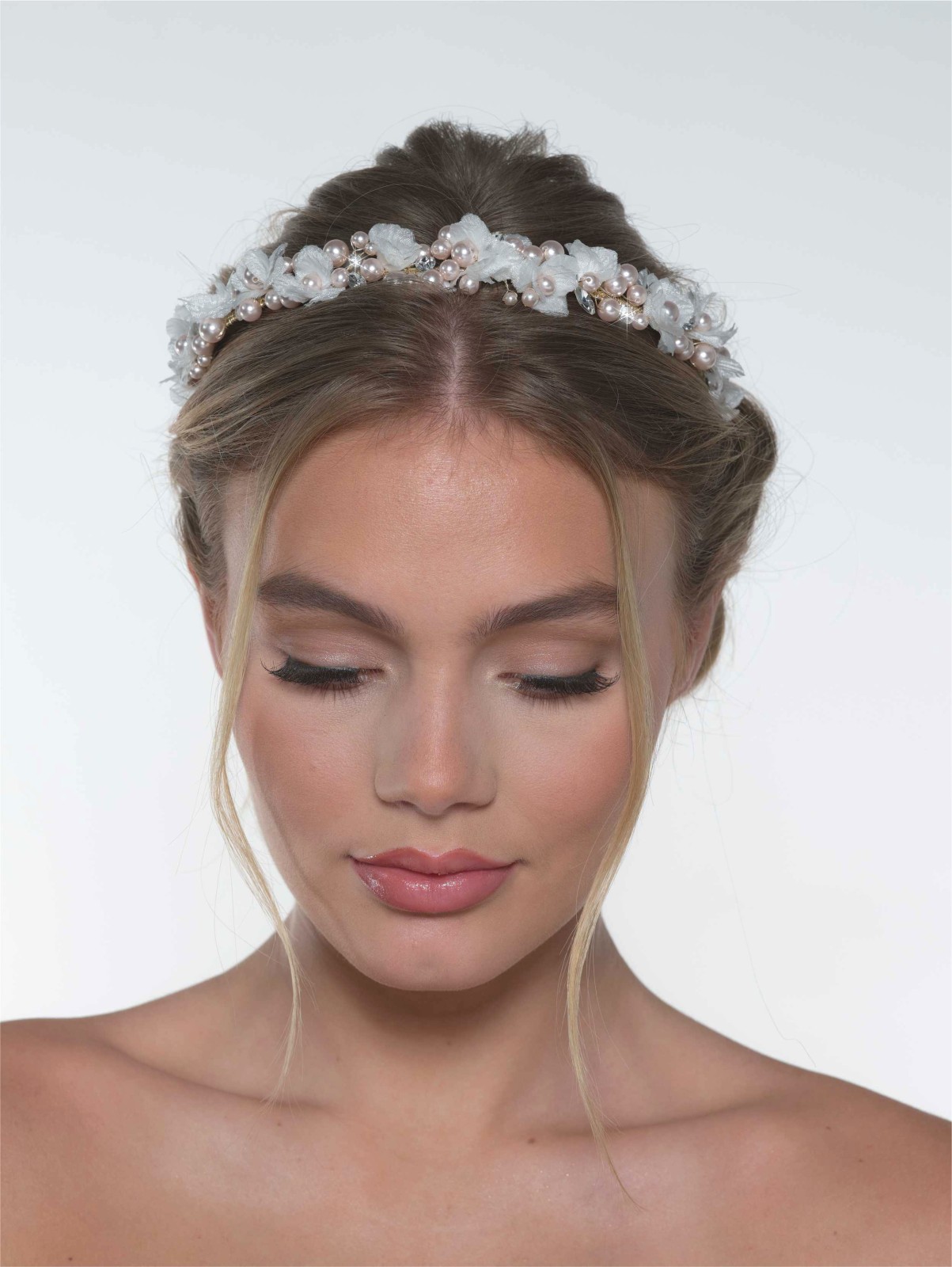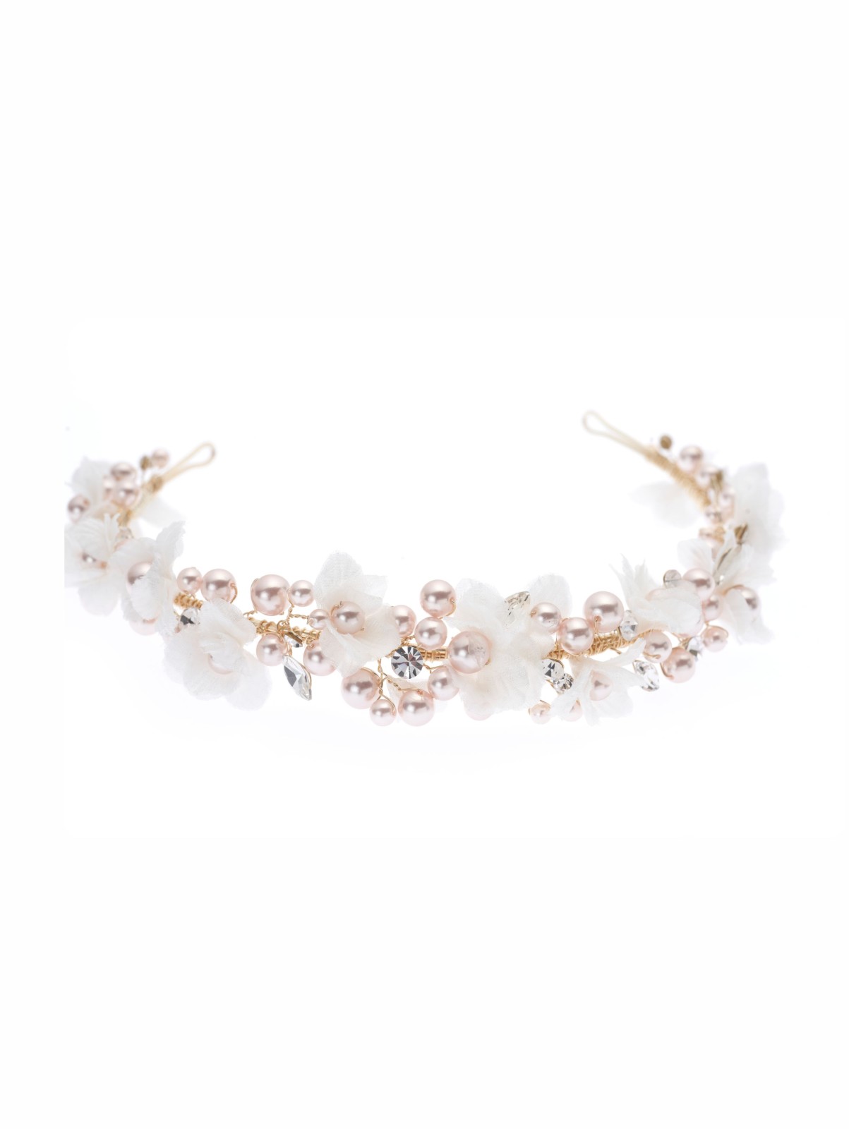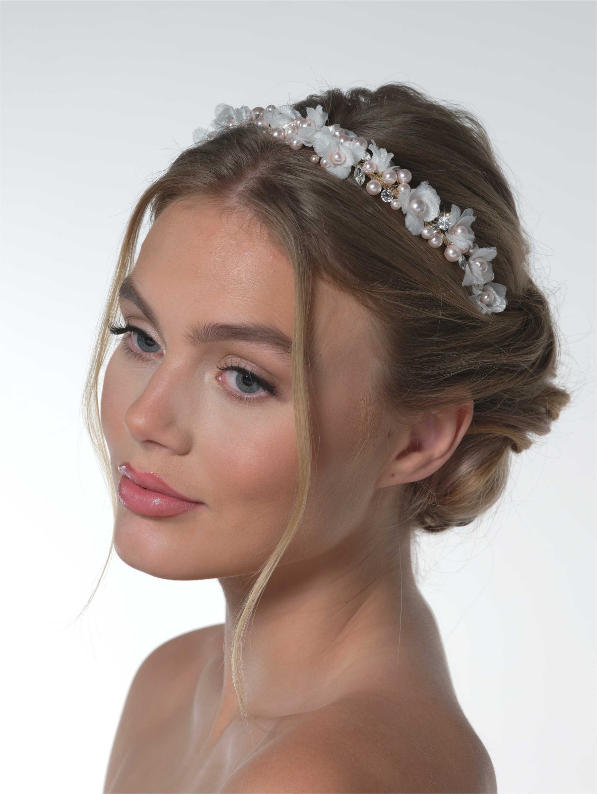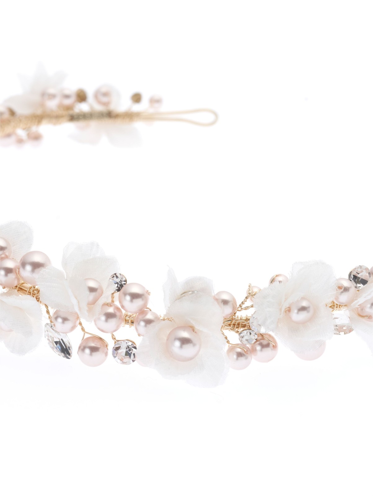 Νυφική στέκα με ρόζ βάση και πέρλες στην ίδια απόχρωση σε συνδυασμό με υφασμάτινα λευκά λουλούδια
