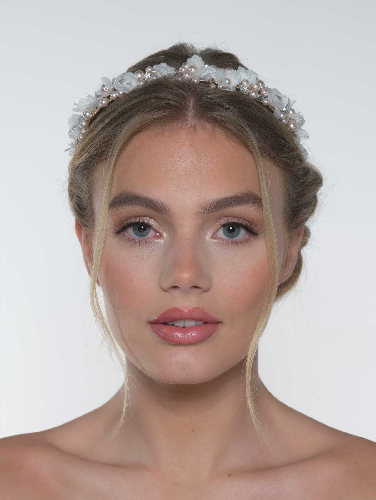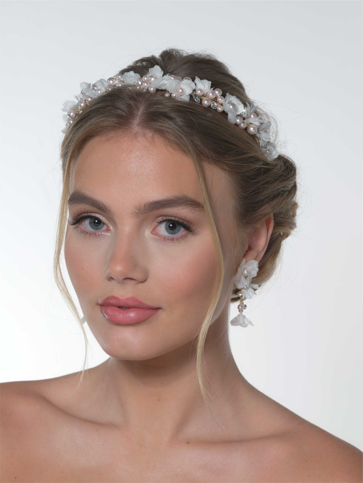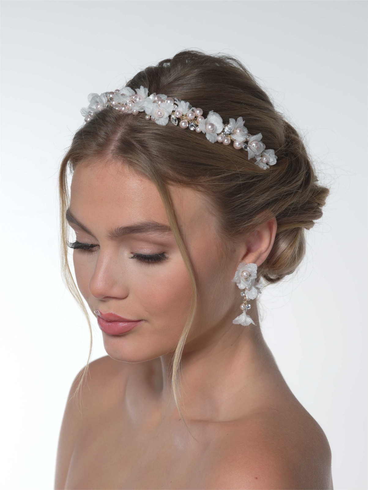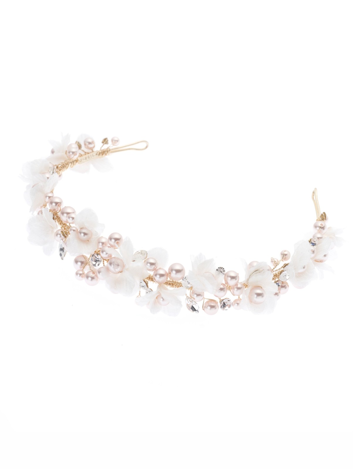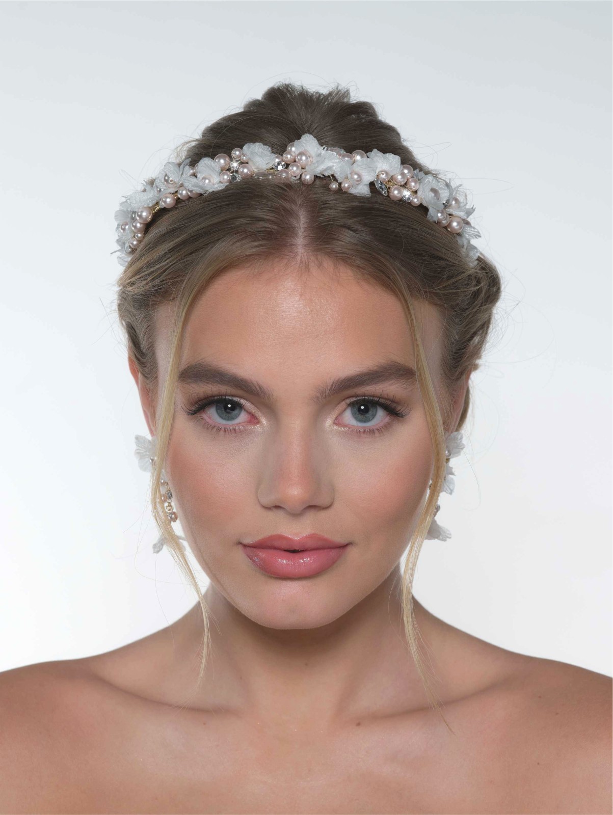 Νυφική στέκα με ρόζ βάση και πέρλες στην ίδια απόχρωση σε συνδυασμό με υφασμάτινα λευκά λουλούδια