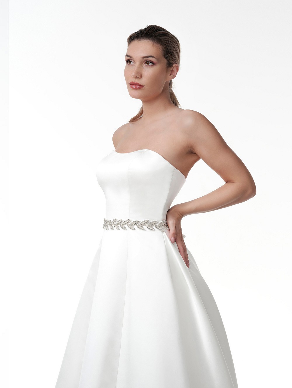 Μάθετε περισσότερα για το προϊόνΝυφική ζώνη με μεταλλική βάση σε μοτίβο φύλλων και στολισμένη με στρας