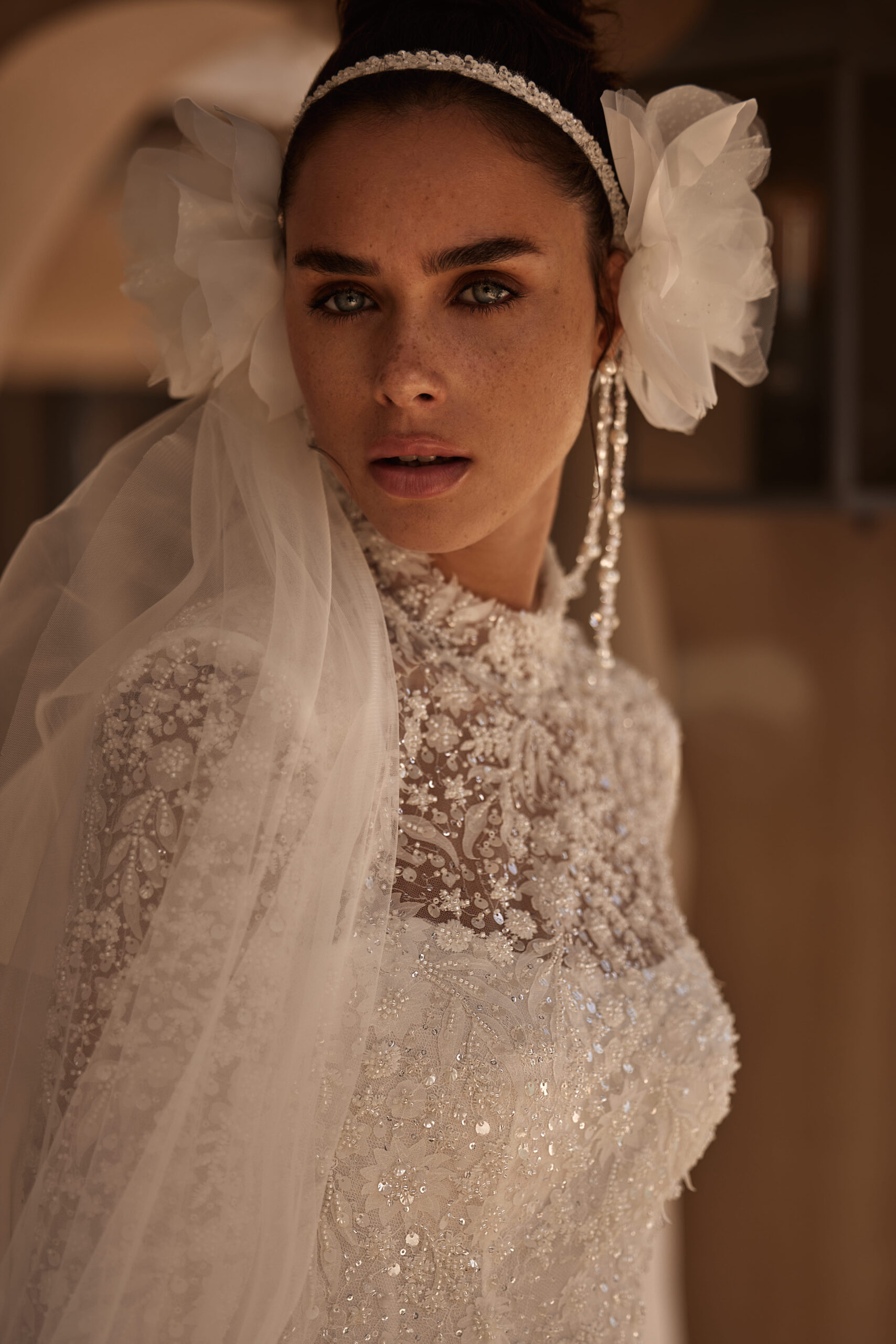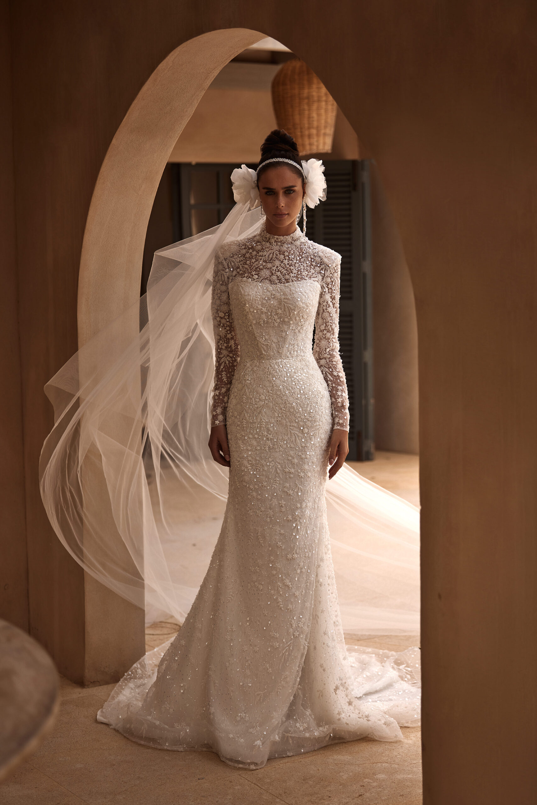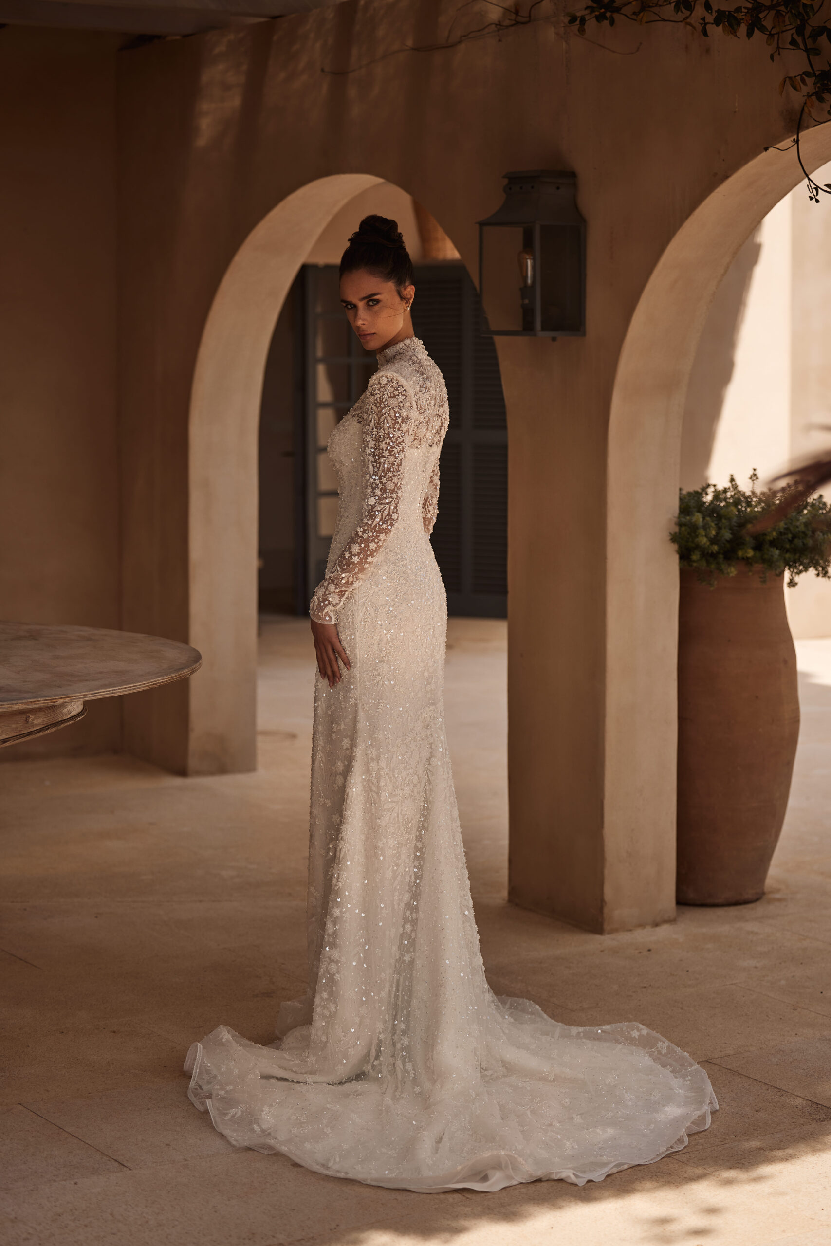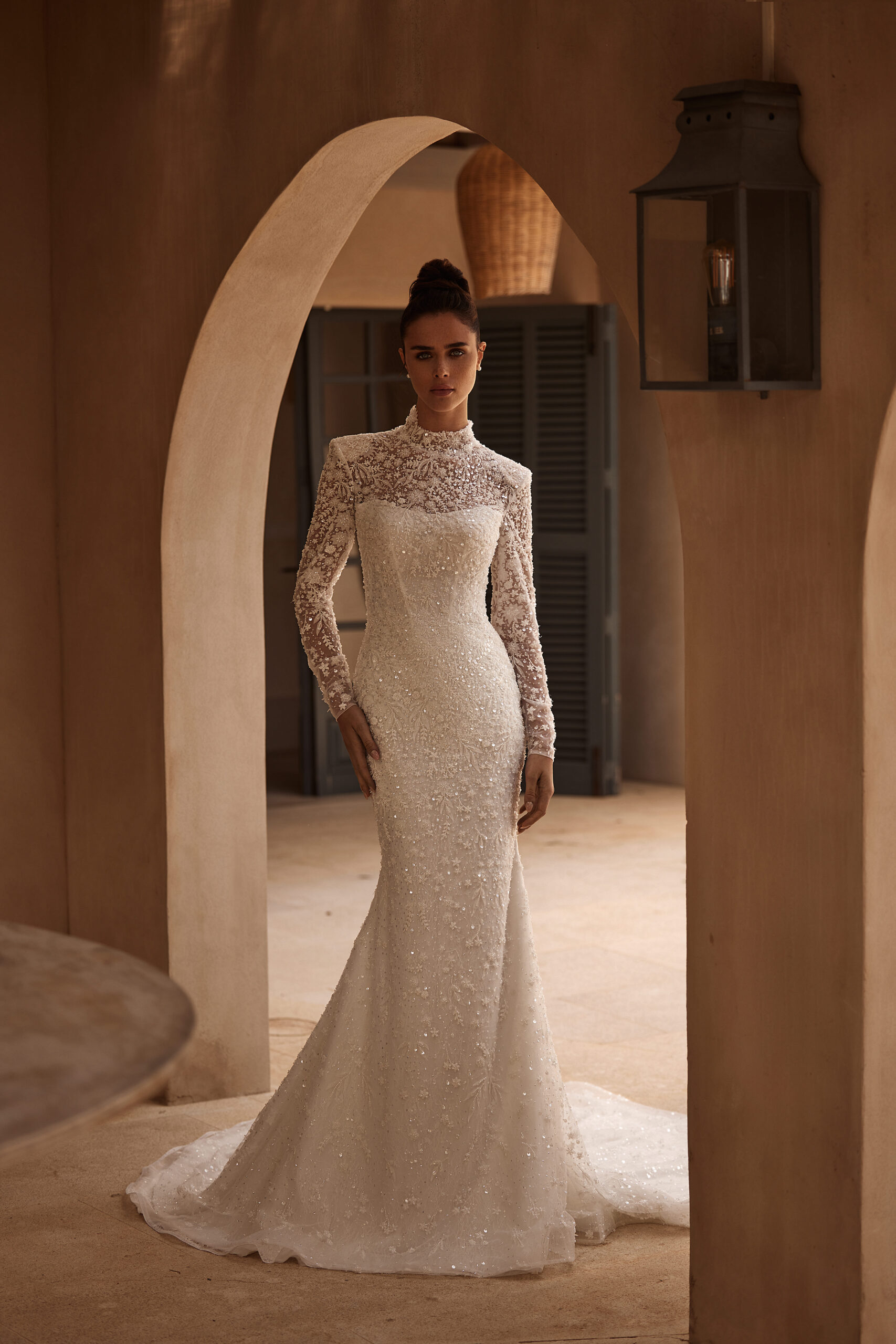 Γοργονέ νυφικό φόρεμα με κεντημένη δαντέλα, βάτες στους ώμους και μακριά μανίκια.