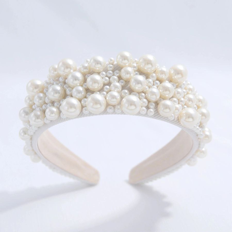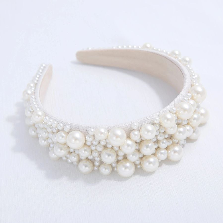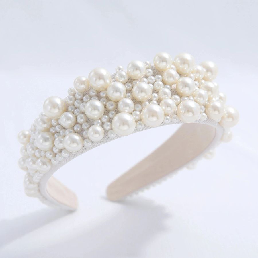 Κλασική, διαχρονική νυφική στέκα με αναλογικό συνδυασμό από μικρά και μεγάλα λευκά μαργαριτάρια. Πλάτος 4εκ.