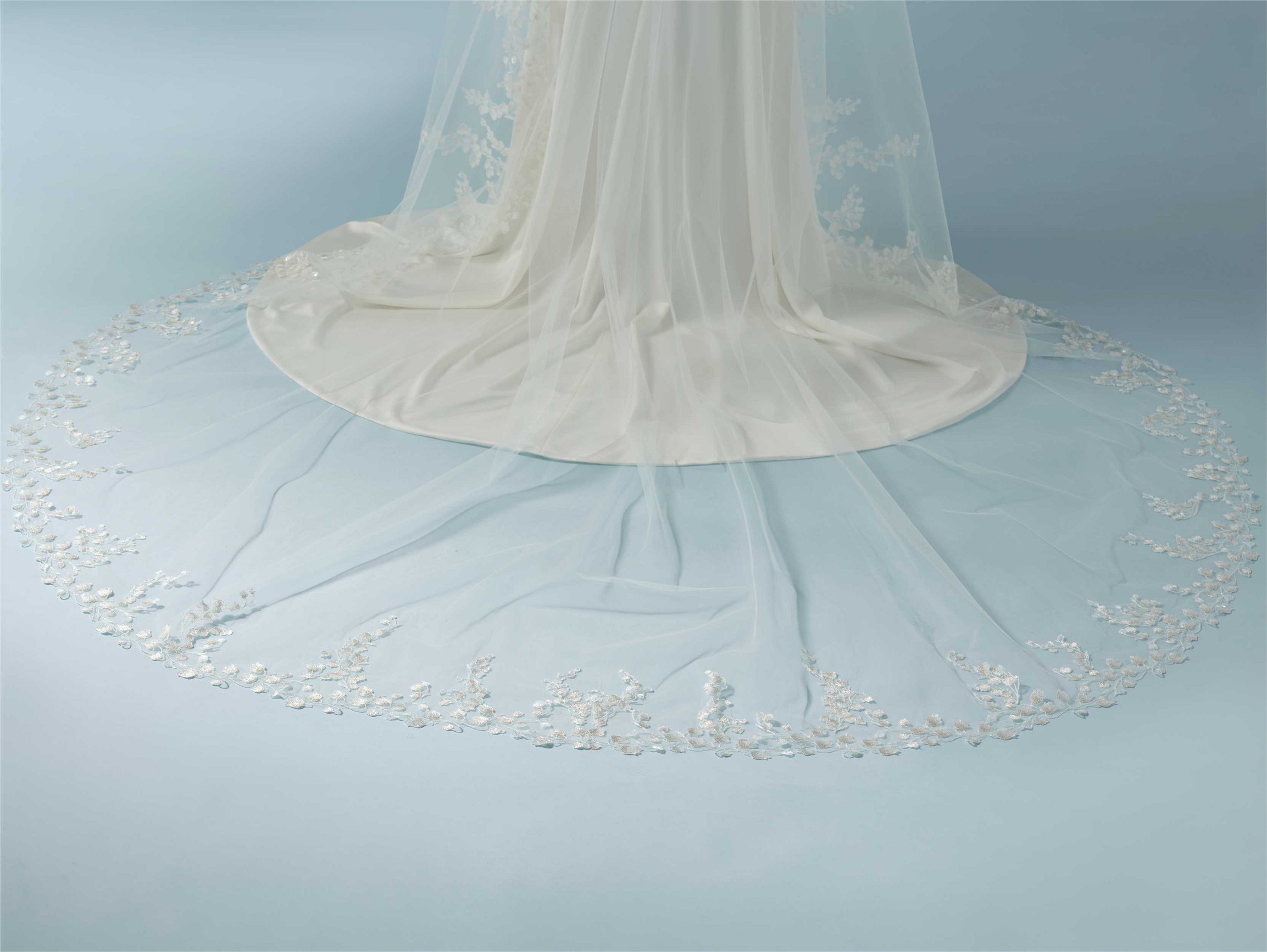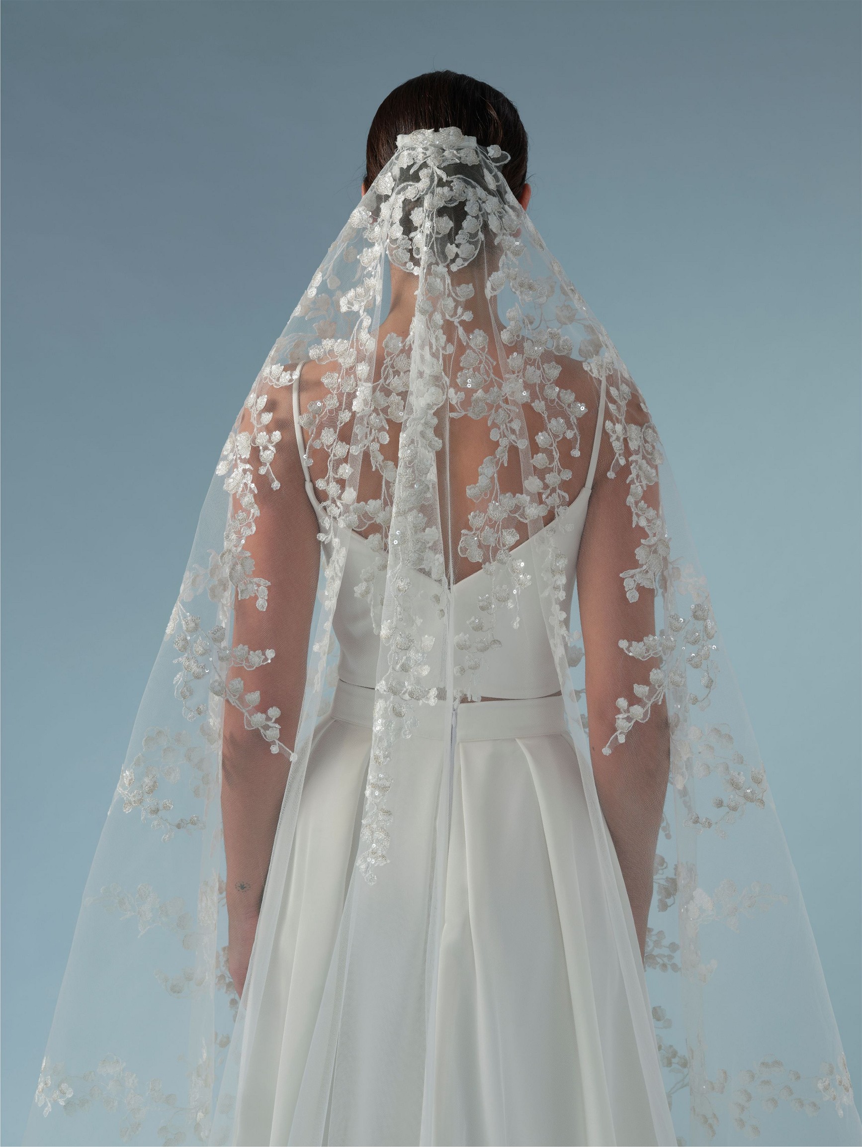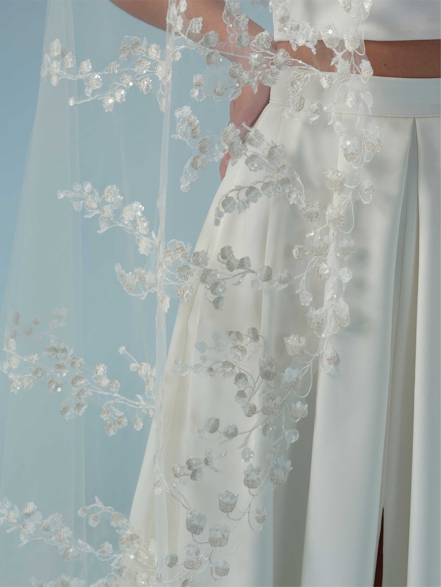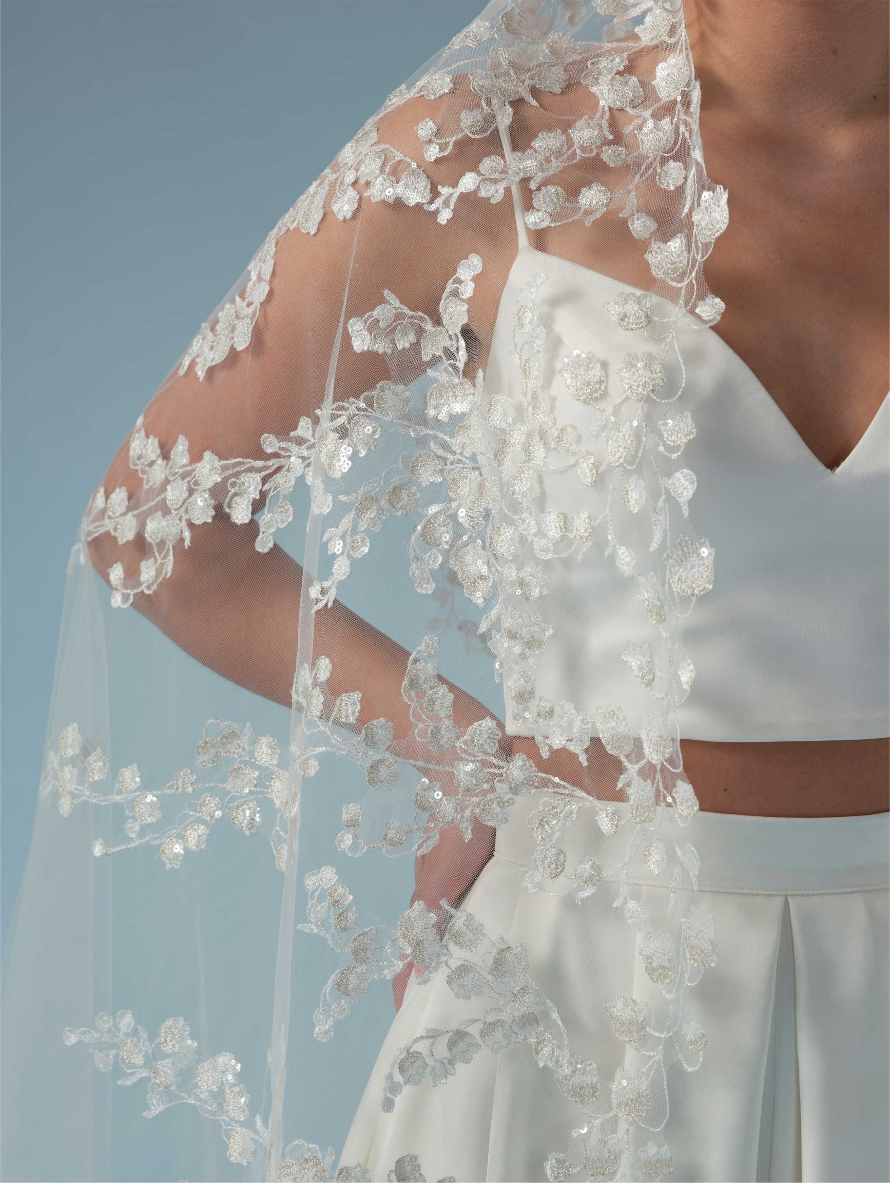 Μονό πέπλο σε τούλι με κεντημένο μοτίβο λουλουδιών , κρύσταλλα και πούλιες