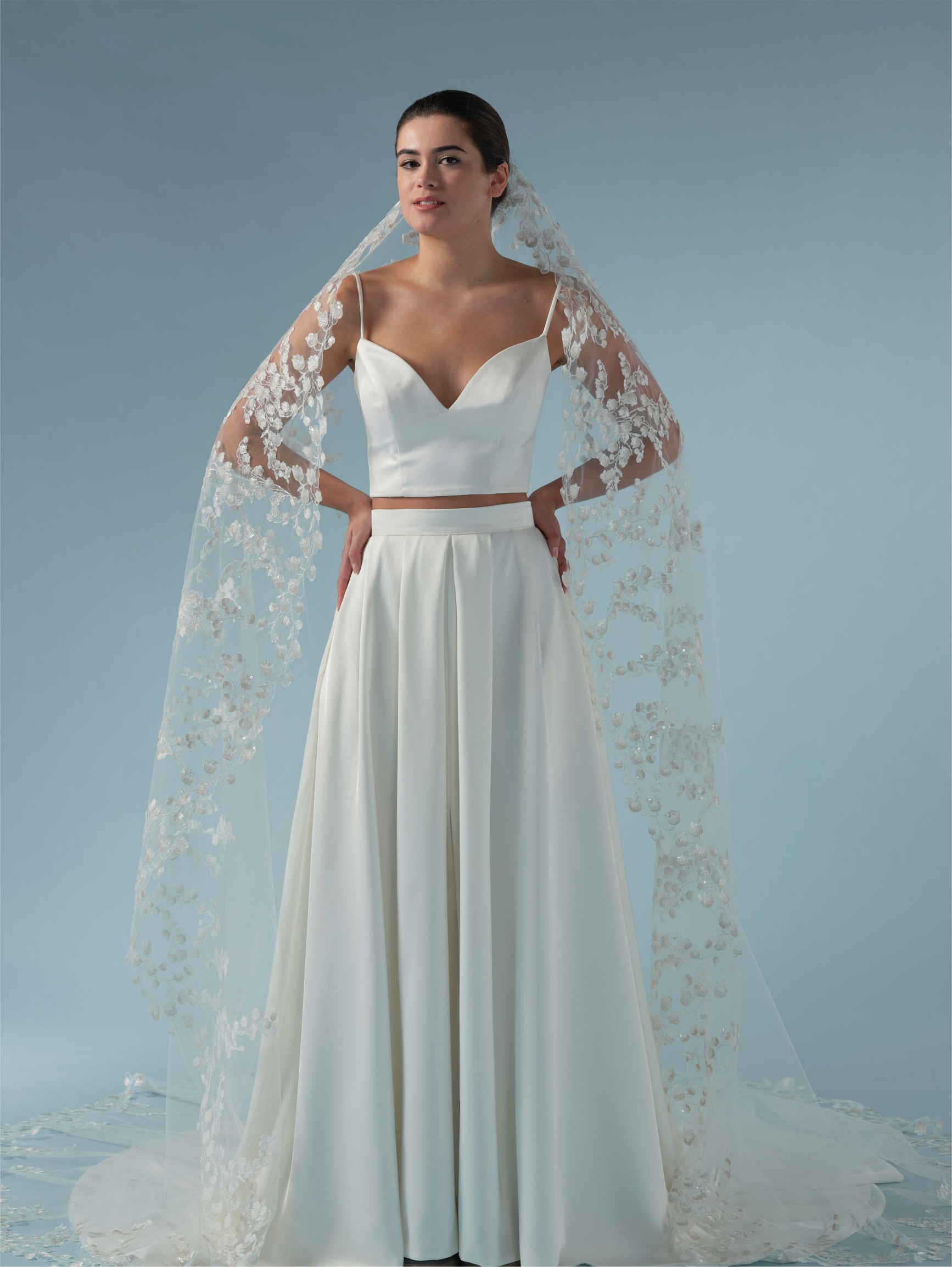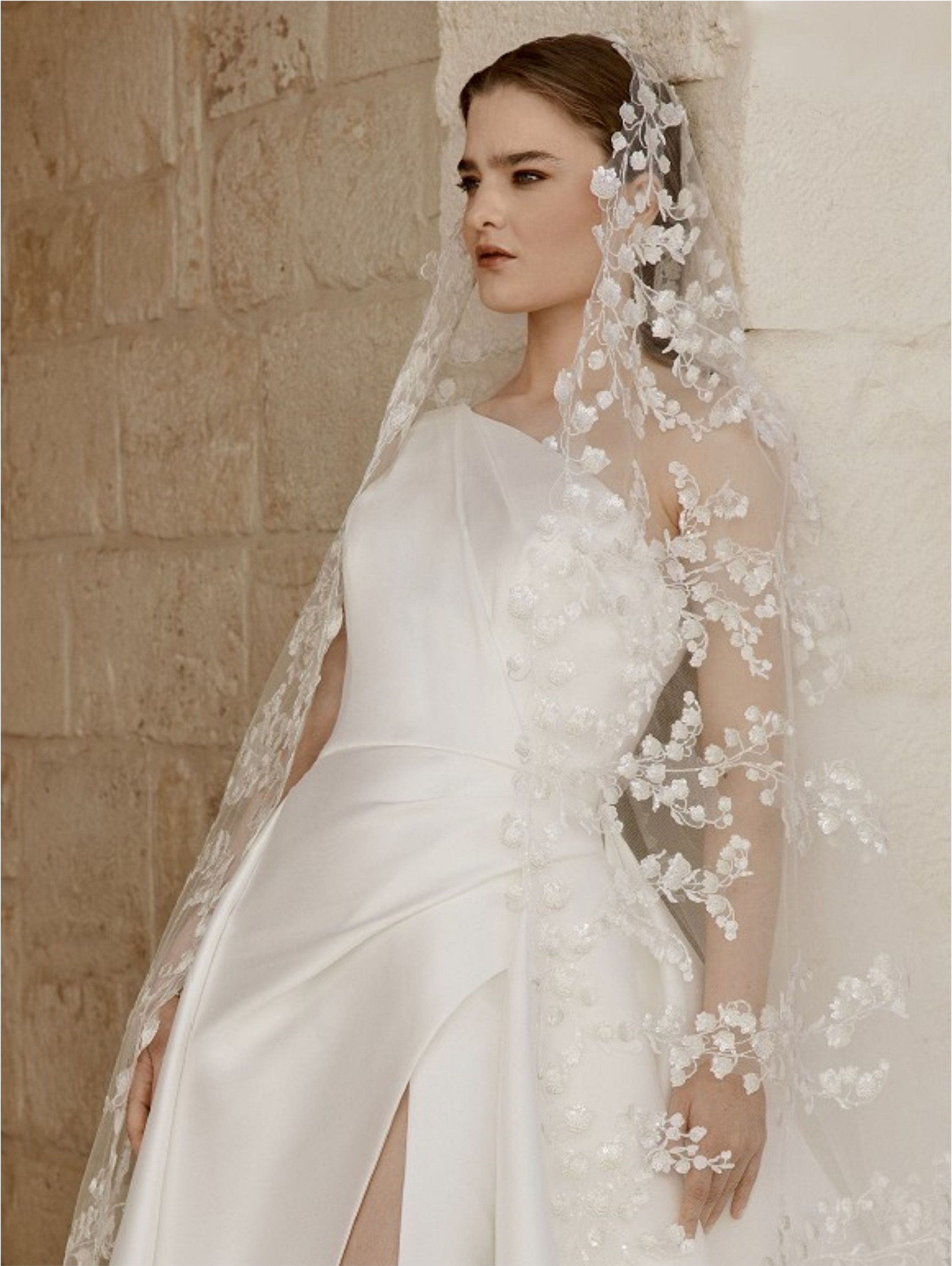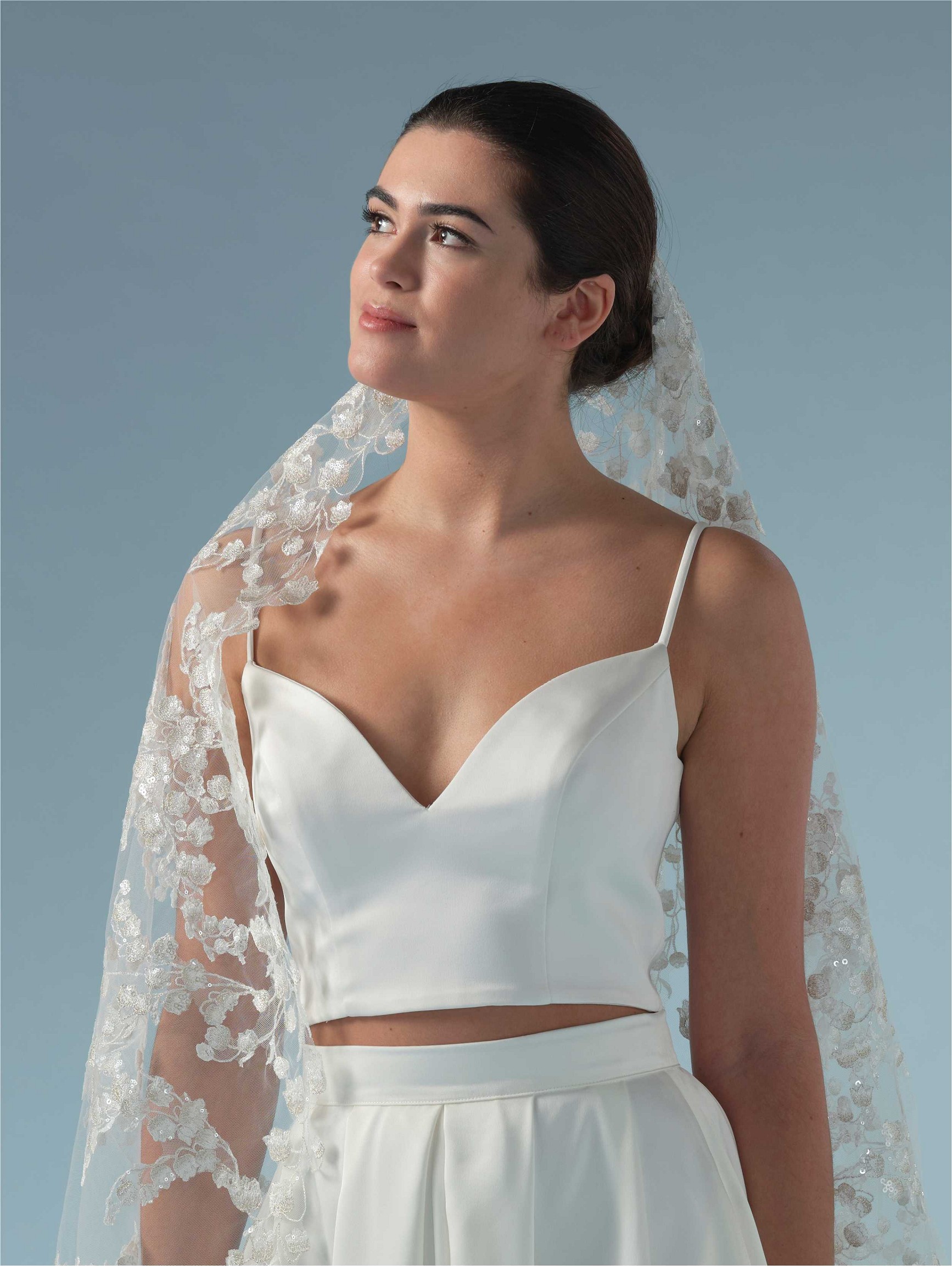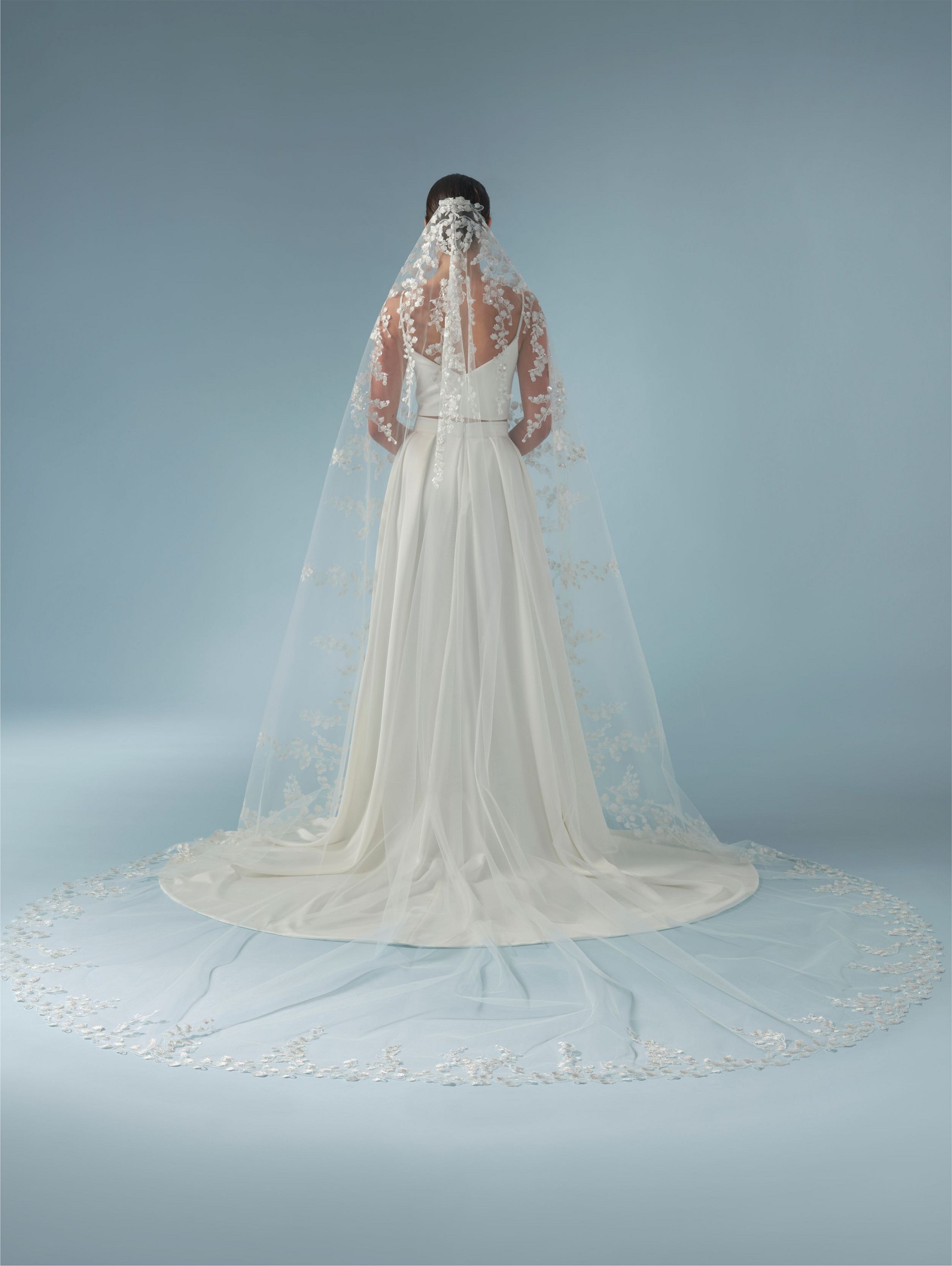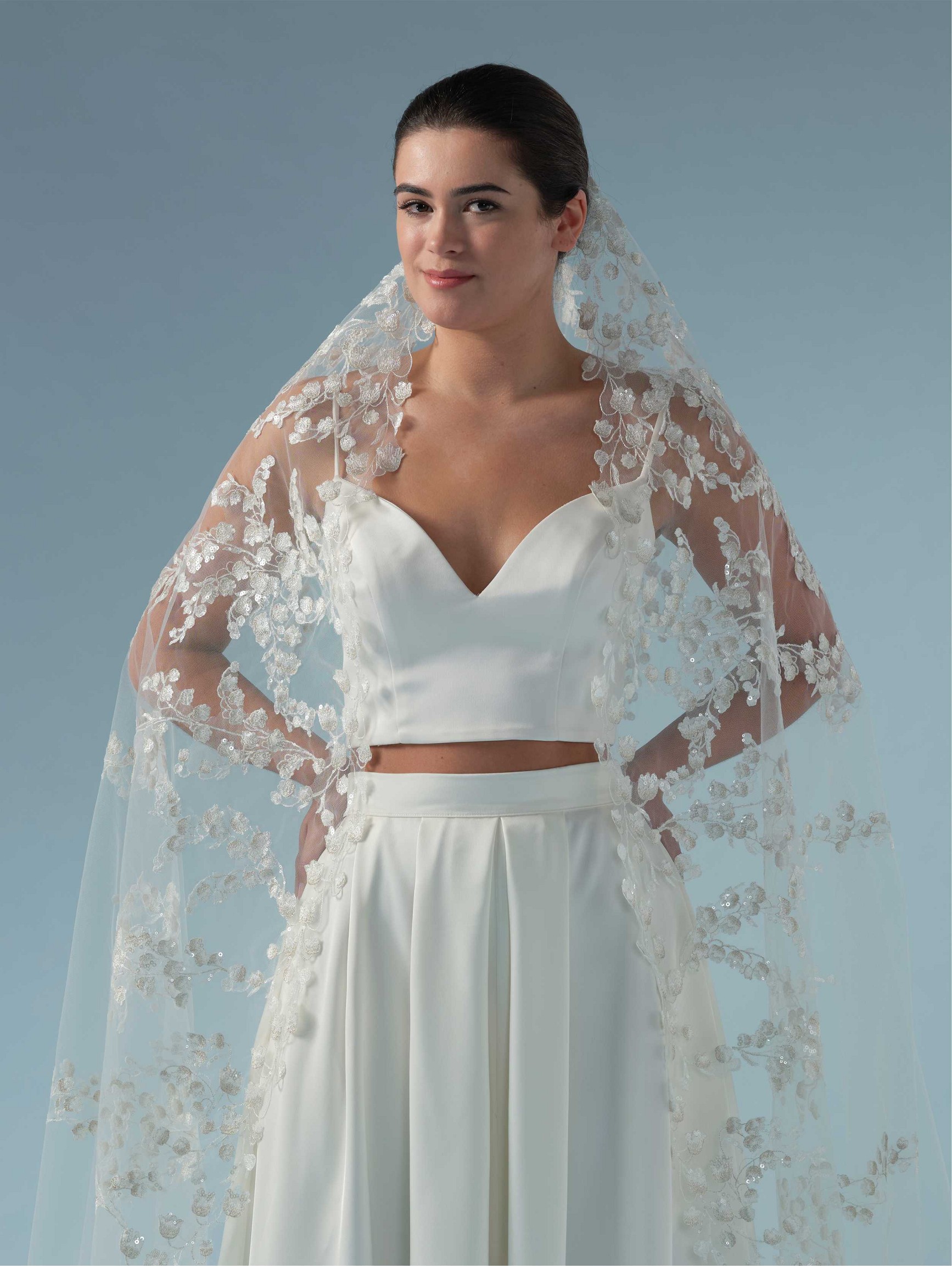 Μονό πέπλο σε τούλι με κεντημένο μοτίβο λουλουδιών , κρύσταλλα και πούλιες