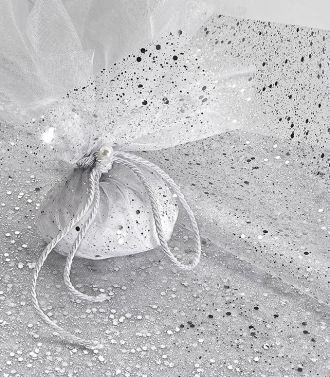 Οργάντζα λευκή διακοσμημένη με γκλίτερ και παγιέτες, κομμένη σε διάσταση 30×30 cm και εσωτερικά μαντήλι τετράγωνο από Οργάντζα 48×48 cm . Συσκευασία 50 τεμαχίων. Ιδανική για ιδιαίτερες και εντυπωσιακές μπομπονιέρες.
