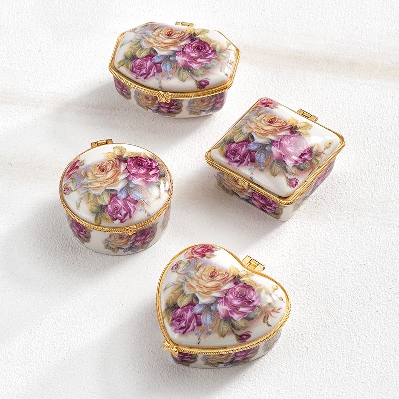 Μπιζουτιέρα από πορσελάνη διακοσμημένη με λουλούδια και με κούμπωμα σε χρυσό χρώμα,κατάλληλη και για γάμο.Η συσκευασία περιλαμβάνει 4 διαφορετικά σχήματα μπιζουτιέρας, στρογγυλό, καρδιά, τετράγωνη και ορθογώνια