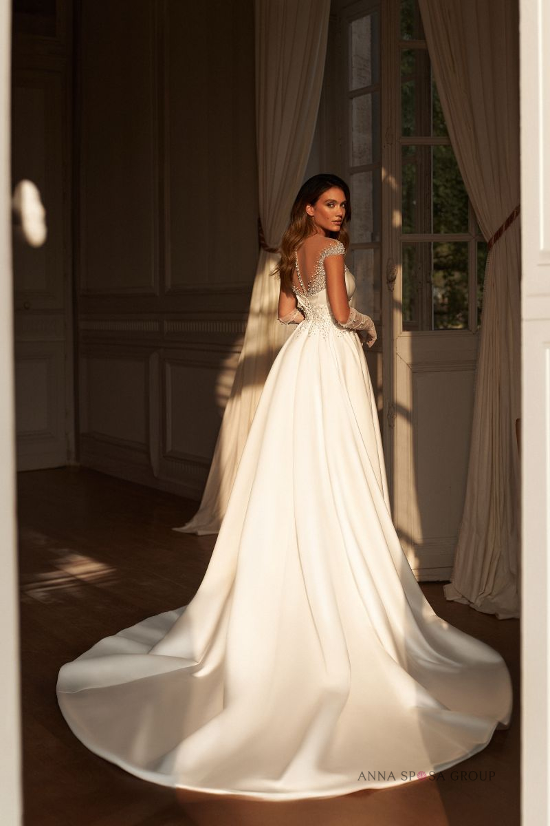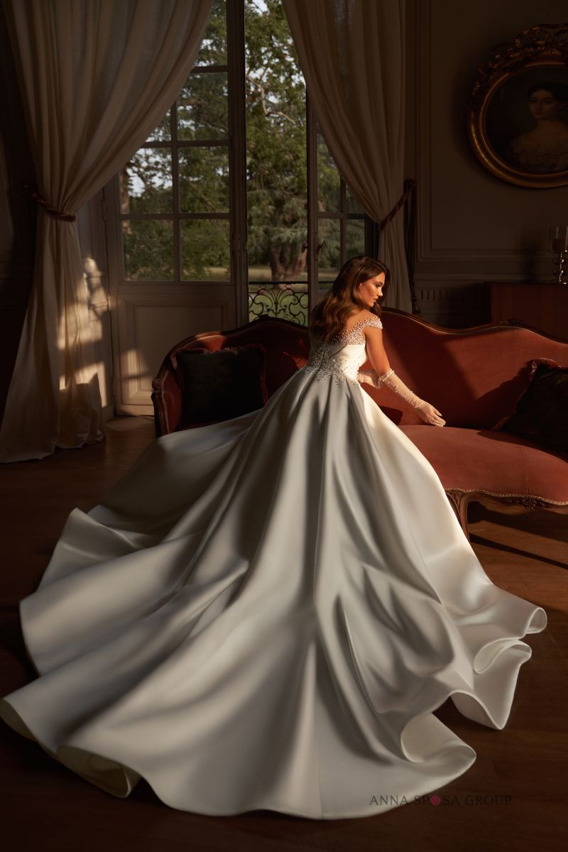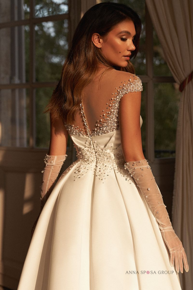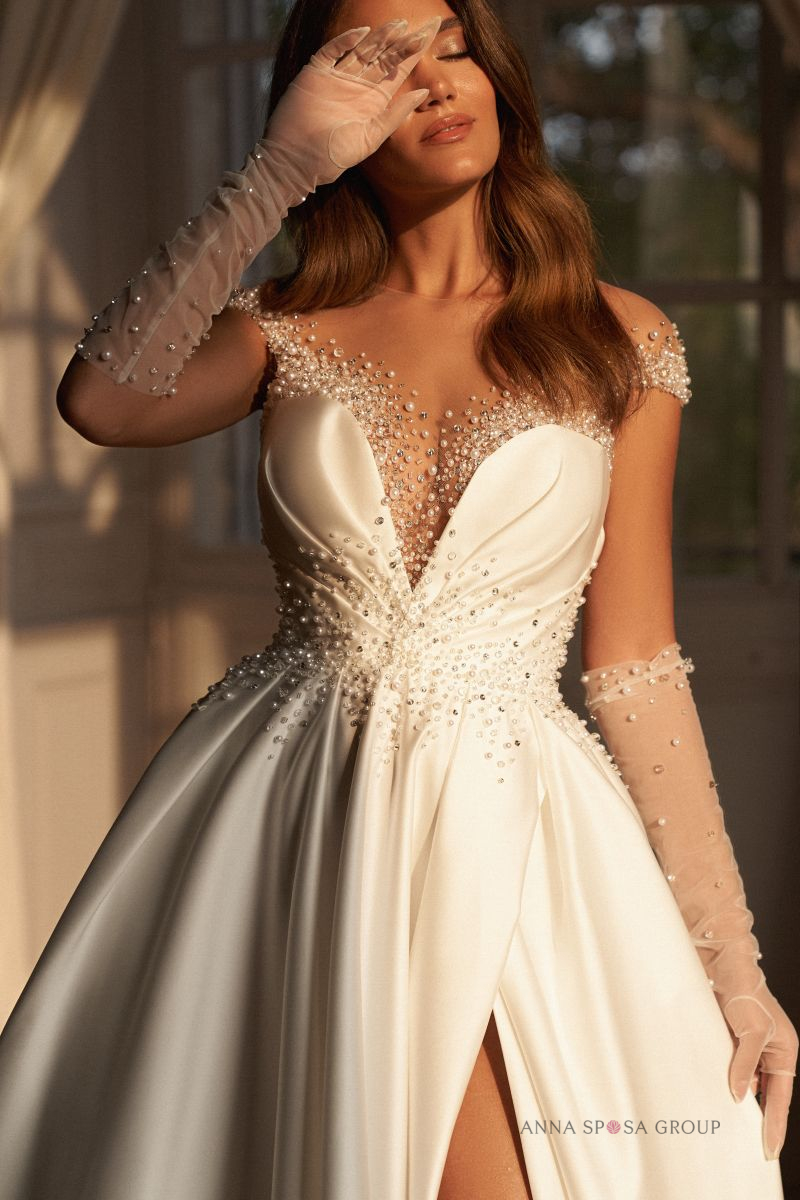 Περιγραφή: Νυφικό φόρεμα σατέν πριγκιπικό διακοσμημένο με πέρλες & κρύσταλλα.