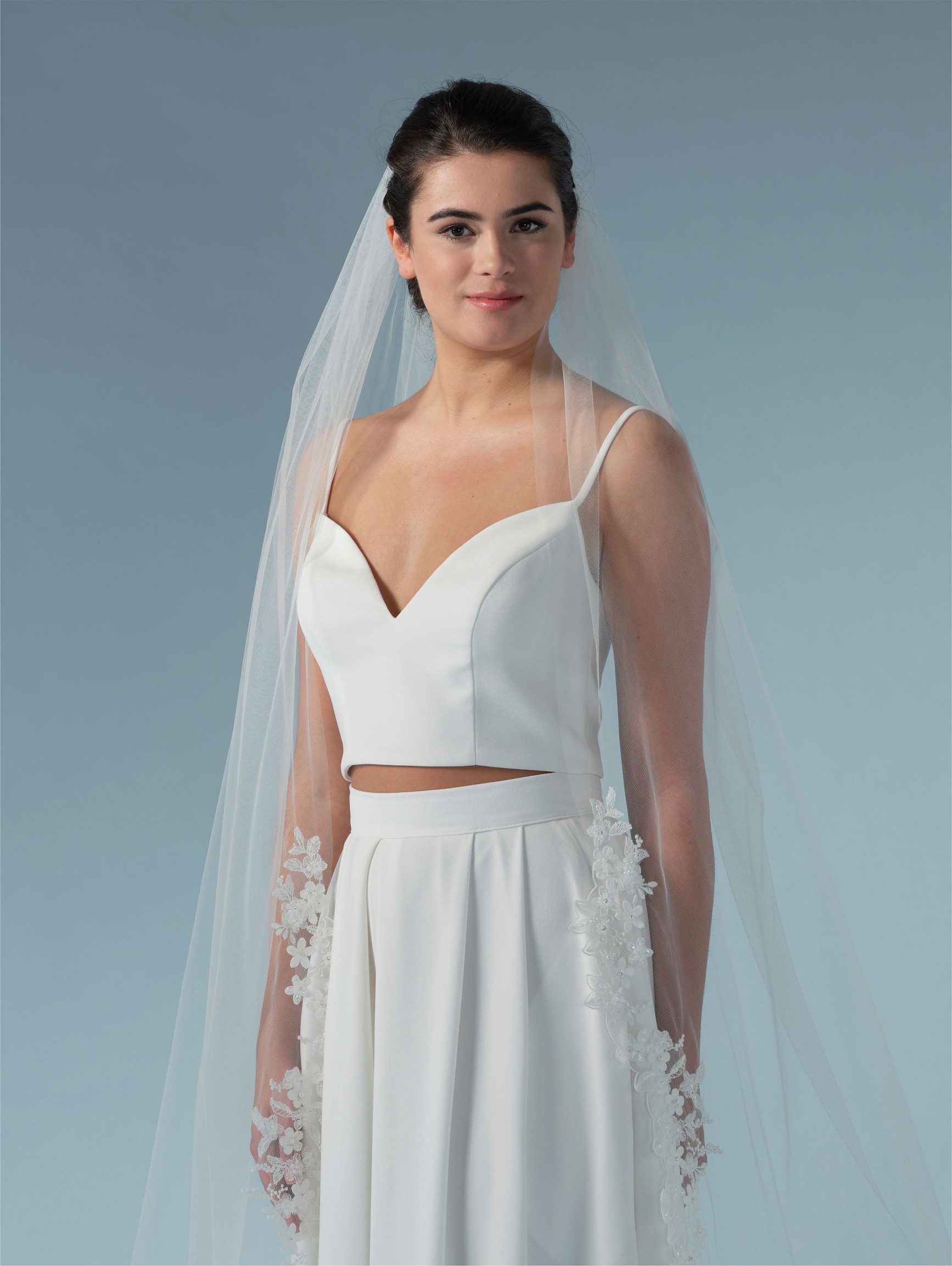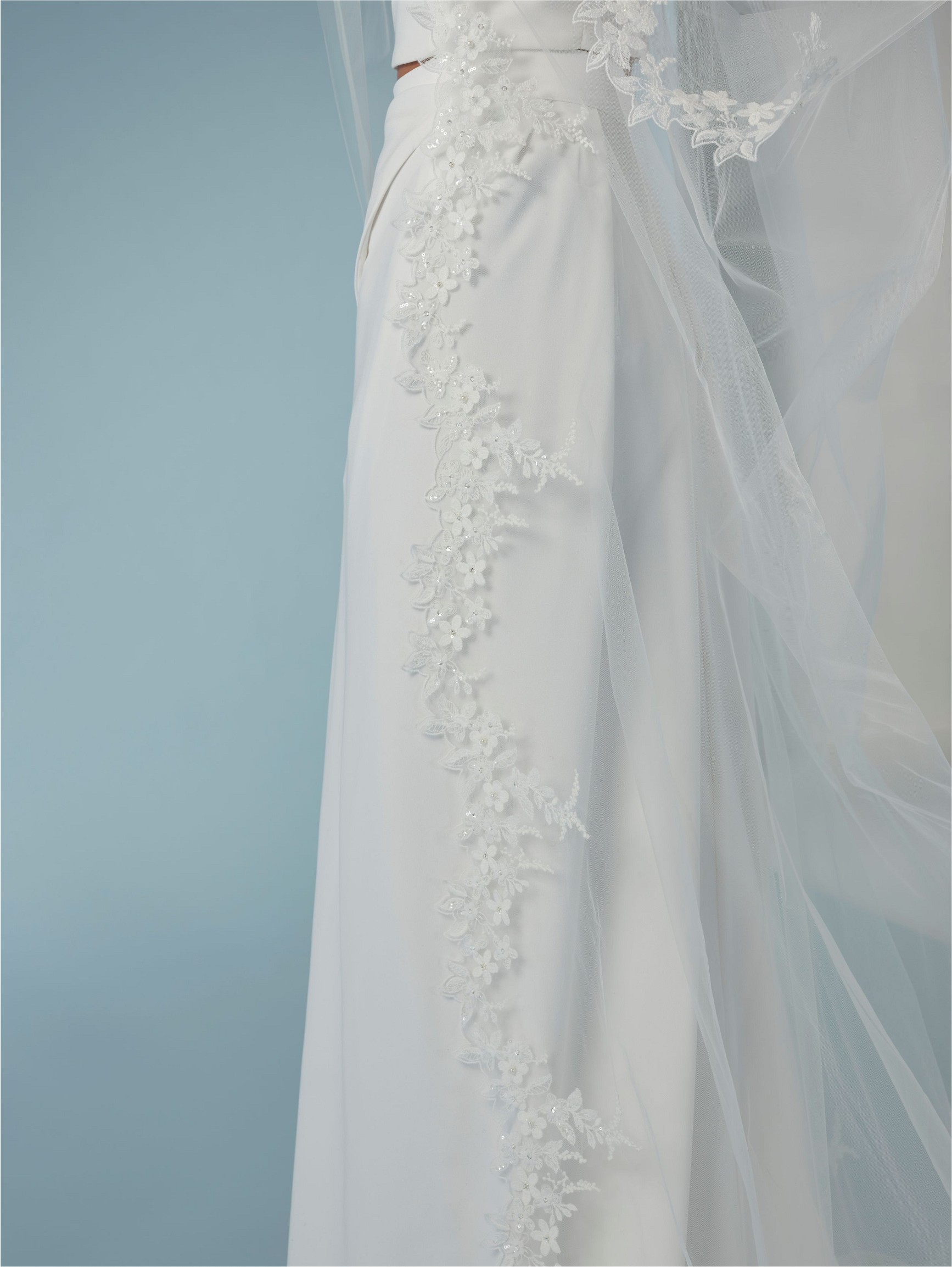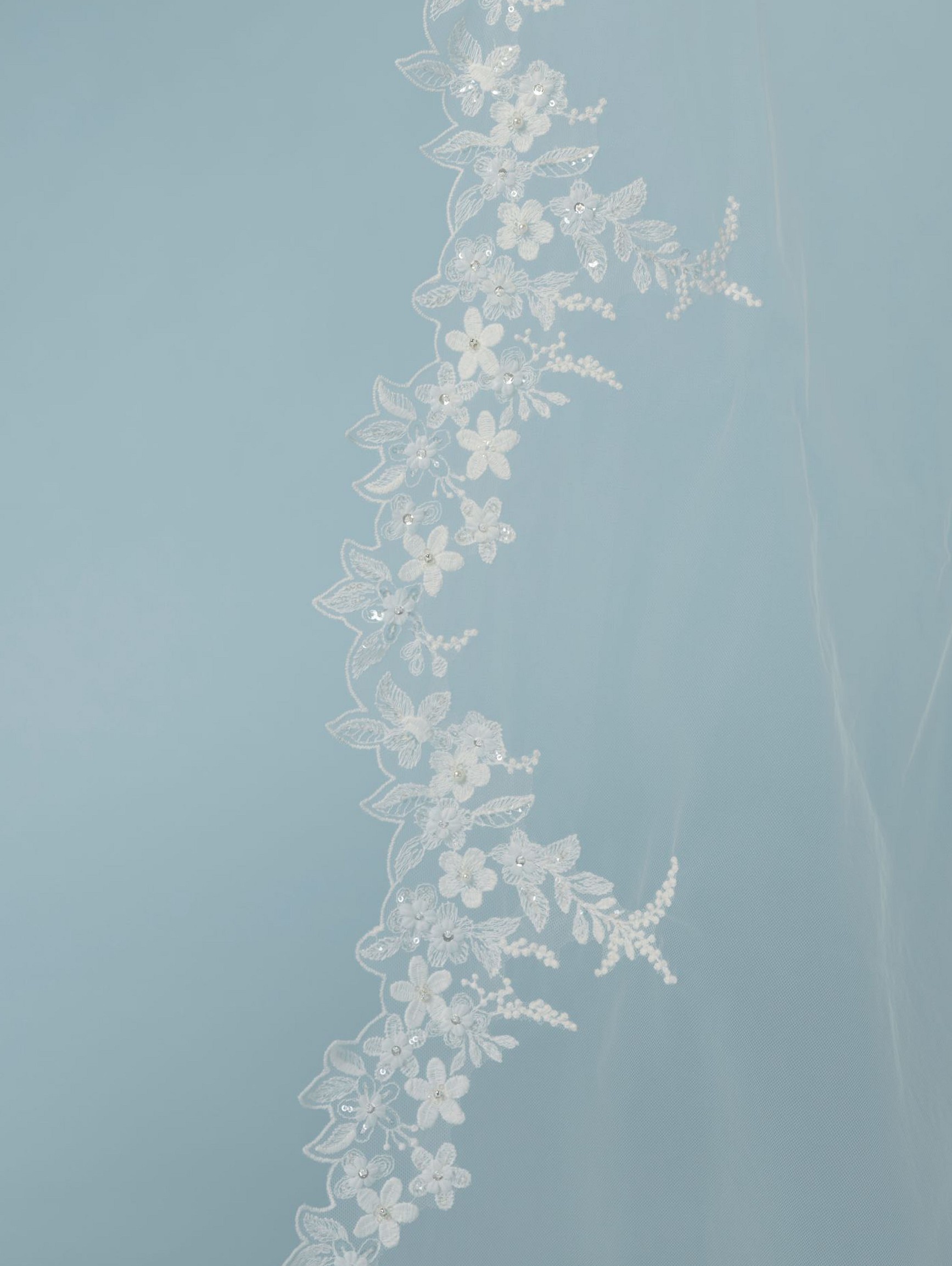 Μονό πέπλο σε τούλι σε συνδυασμό από κεντημένα πολυτελή λουλούδια σε μοτίβο μαζί με πούλιες